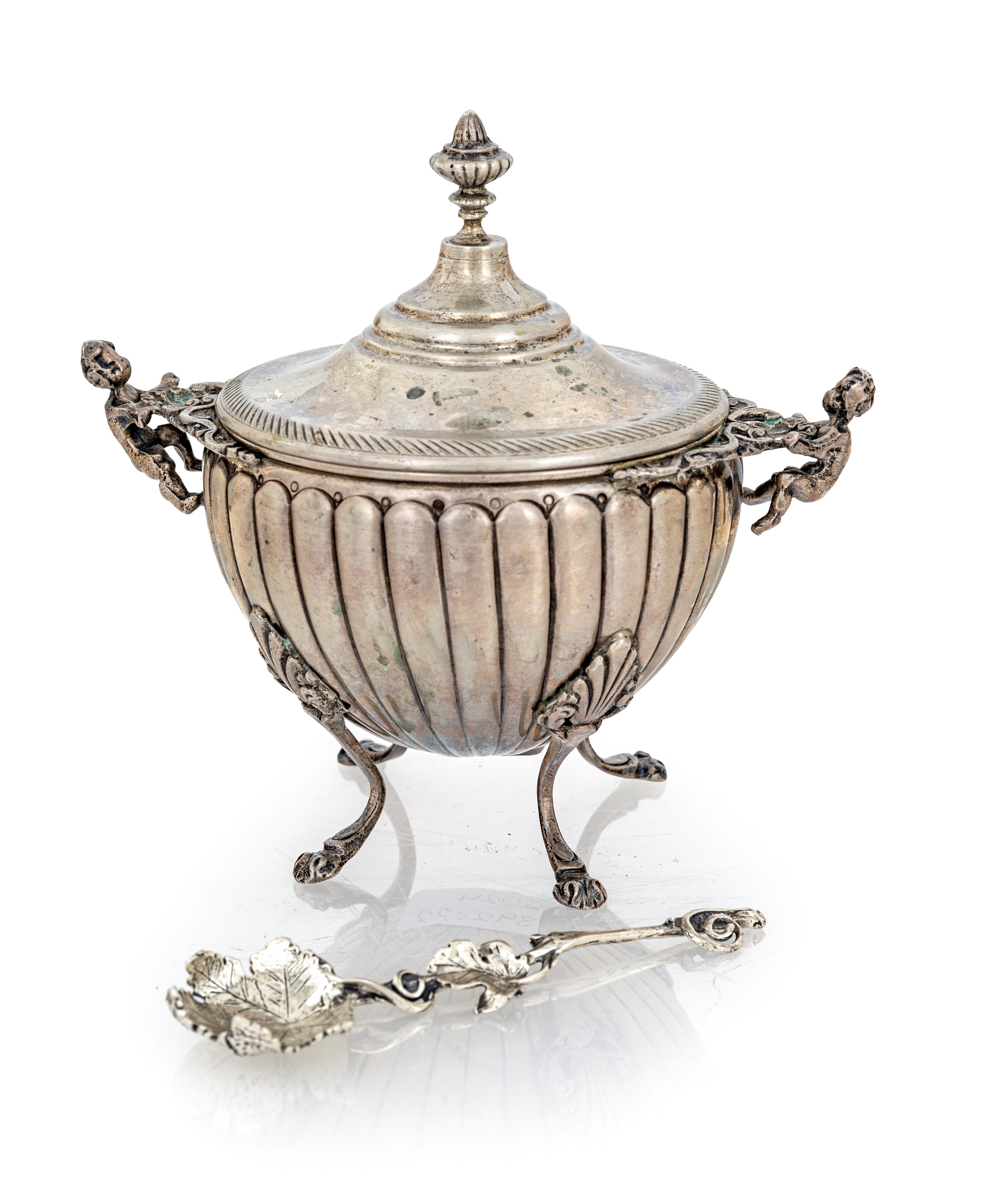 Zuccheriera in argento con coperchio e manici a forma di amorino