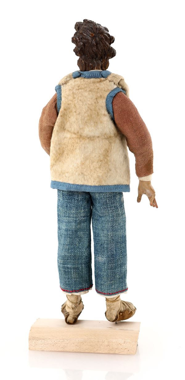 con capelli mossi e bocca socchiusa; camicia marrone, gilet in pelle di pecora, pantaloni azzurri e ciocie ai piedi