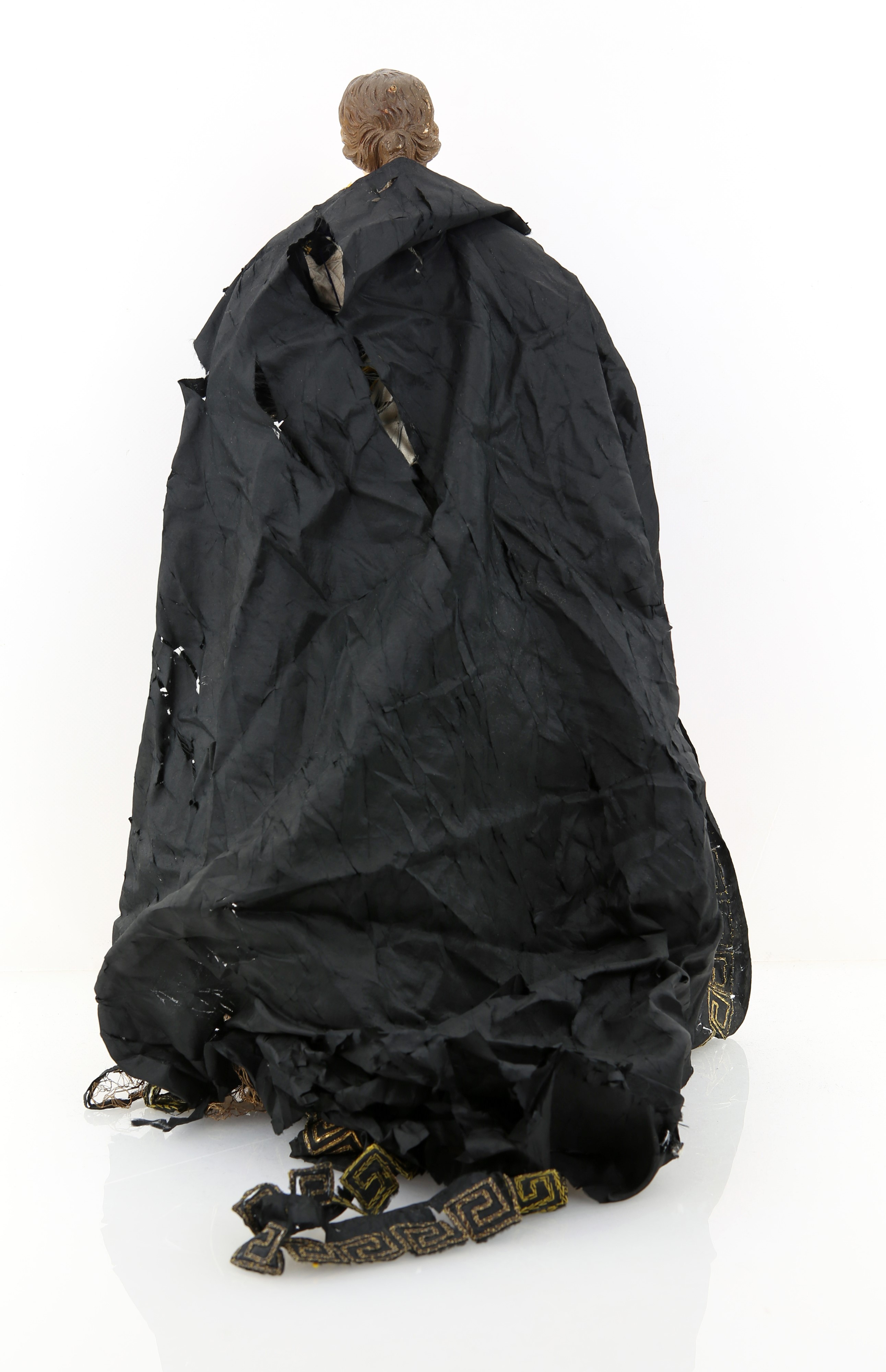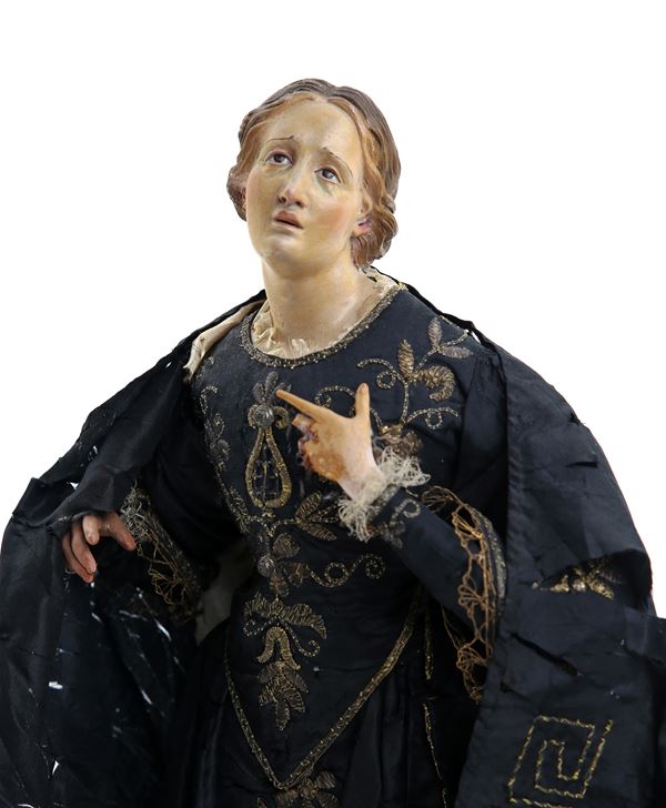 con ricca veste ricamata rifinita da mantello; base in legno dorato; difetti e mancanze
