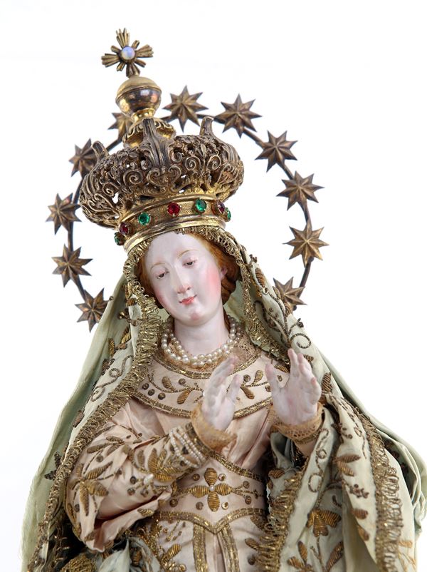 con ricca veste ricamata rifinita da gallonatura, ritratta stante su globo celeste su cui posa un serpente, arricchita da teste di cherubini modellate a tutto tondo; corona e aureola in metallo argentato; protetta da campana in vetro a pianta rettangolare; base mancante