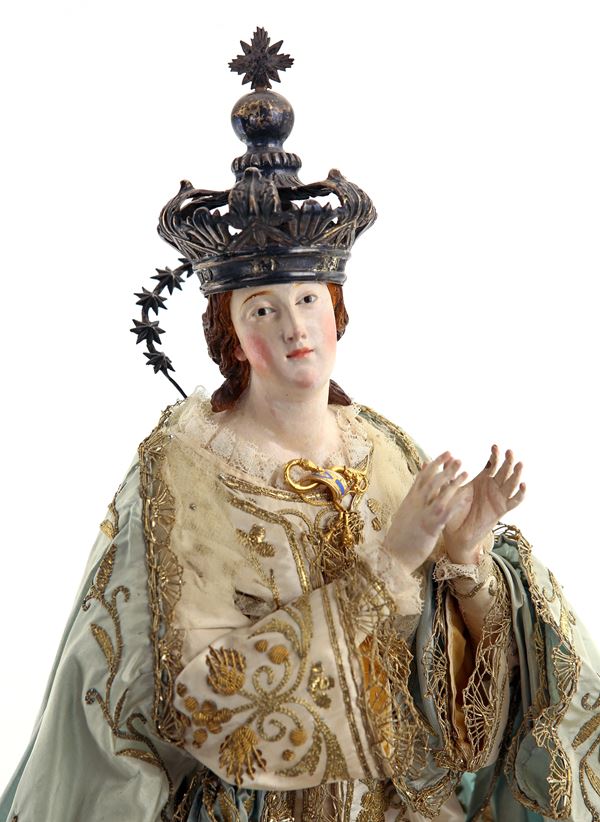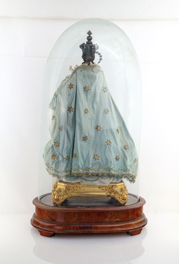ricca veste ricamata rifinita da mantello azzurro con stelle ricamate; corona e aureola stellata in metallo argentato; basso piedistallo dorato su base ovale in mogano con fregio frontale intagliato e campana in vetro
