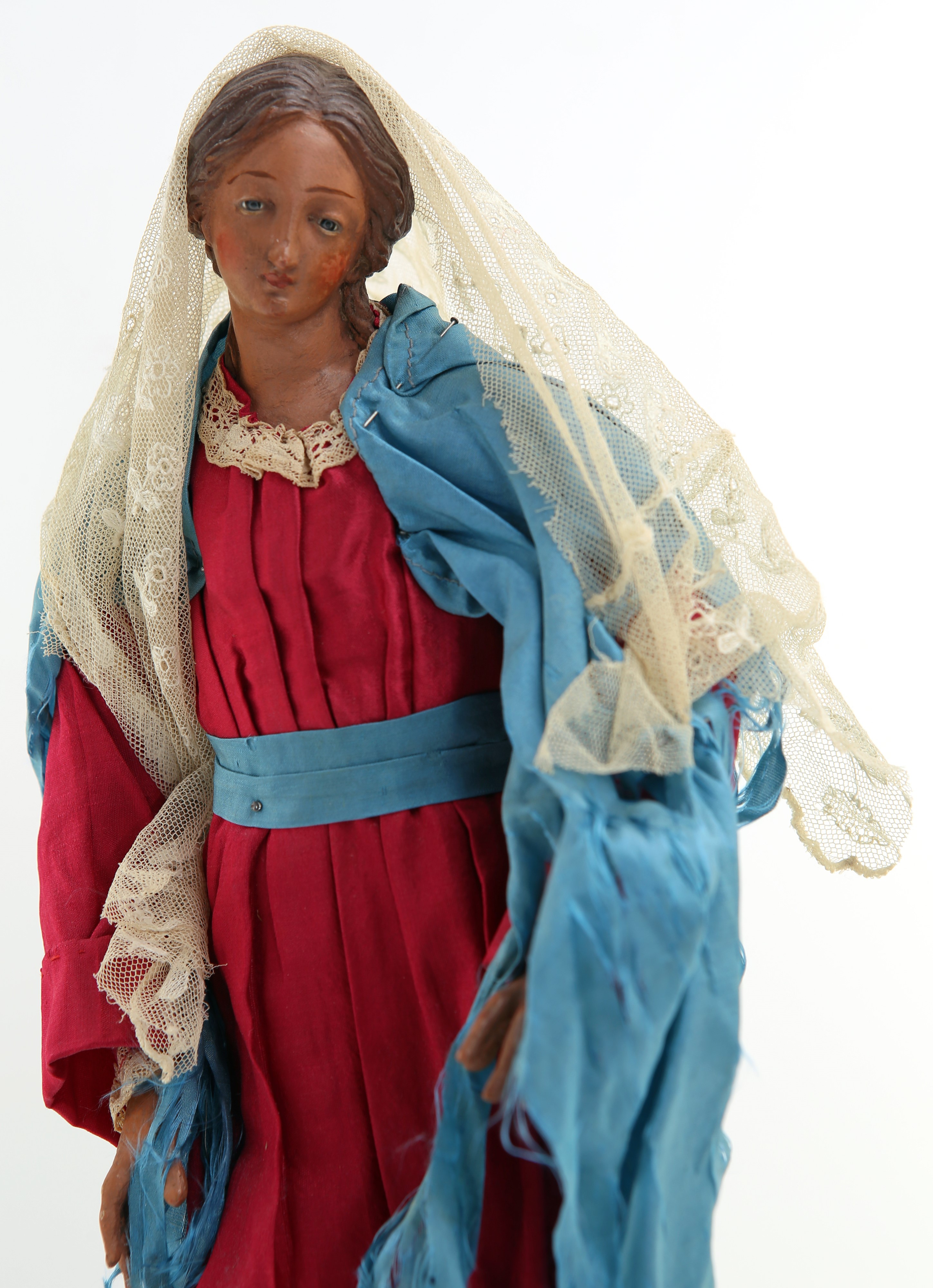 veste rosso porpora trattenuta in vita da fusciacca turchese, orlo girocollo di merletto, mantello azzurro e scialle di merletto