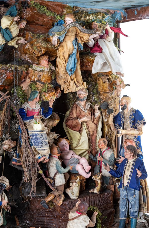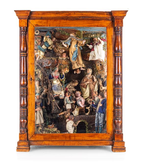 anta frontale delimitata da lesene composite, piedi a mensola; la struttura interna, realizzata in cartapesta, sughero e legno con inserti di muschio e piccole fronde, si compone di più livelli atti ad ospitare figure di diversa misura