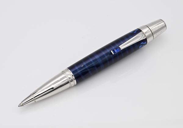 Montblanc Bohème Paso Doble Bleu 104919 - Penna a sfera in metallo con finiture platino e pietra color zaffiro, con lacca bleu incisa con motivo ispirato alla danza del Paso Doble Mod 25579