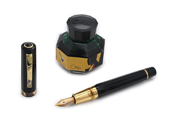 Omas Paragon - Penna stilografica in vernice nera e argento 925/000 placcato in oro giallo, con particolari dorati, 2006