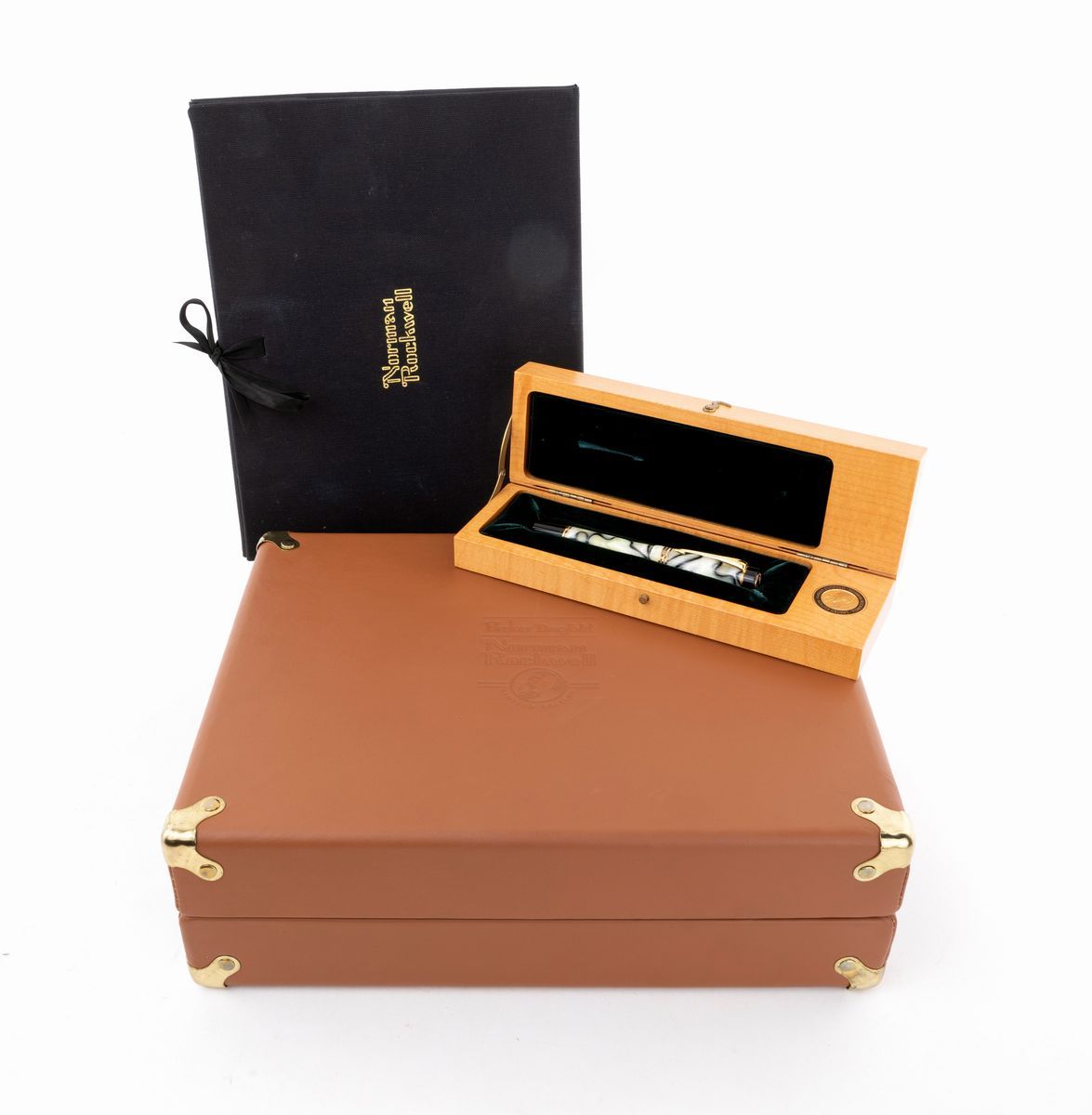 Pennino X in oro bicolore 18Kt. Edizione limitata in 3500 esemplari, Ns. n. 3199. Anelli di rifinitura in oro. Sul cappuccio medaglietta d'oro con l'immagine di Norman Rockwell. Dentro astuccio di legno. Con istruzioni, certificato d'autenticità, garanzia, 4 cartucce d'inchiostro e set di acqueforti numerate entro valigetta di pelle con panno di custodia originali.