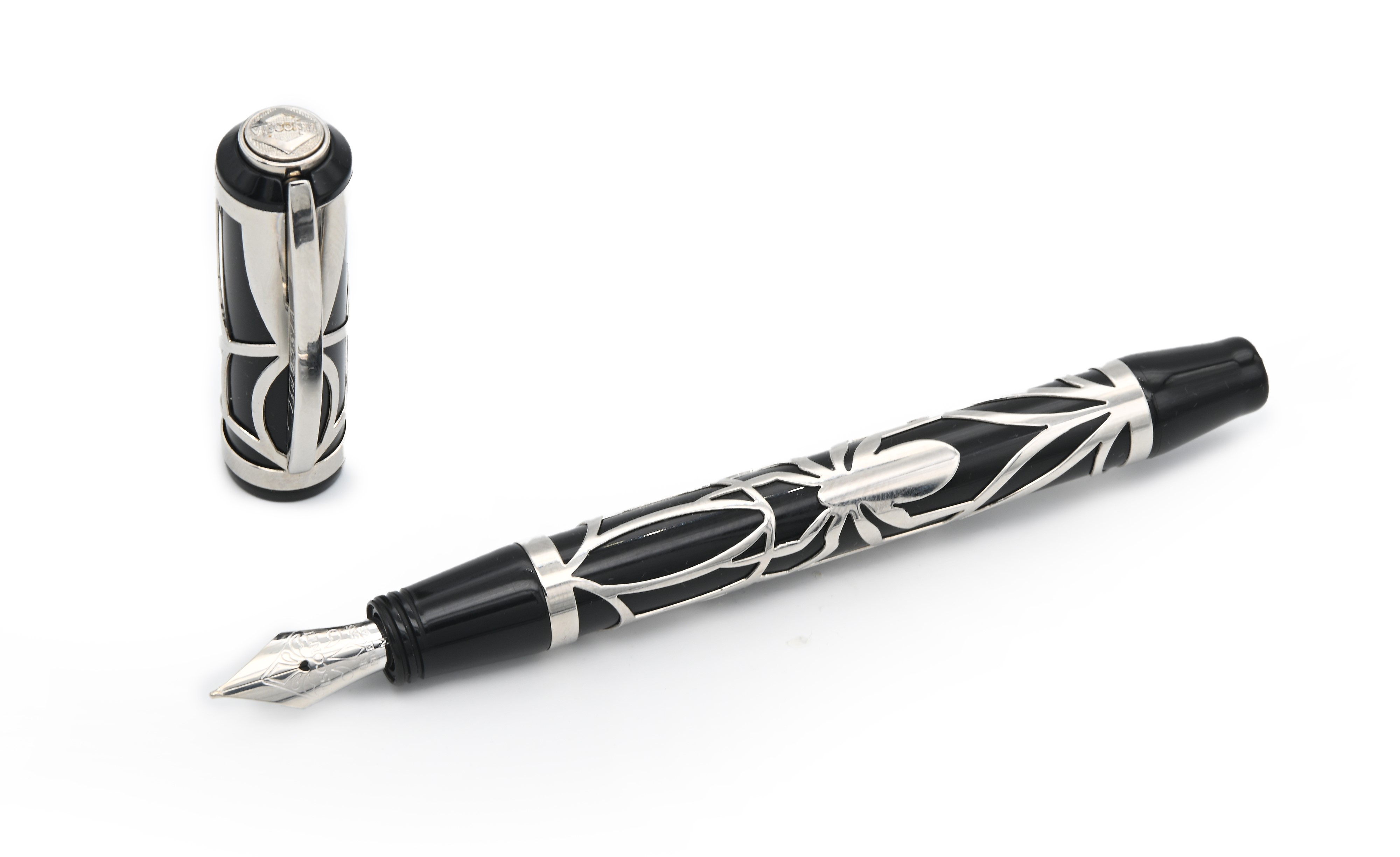 Visconti Istos Aracnis - Penna stilografica con fusto in resina nera rivestita di filigrana che imita un ragno su una ragnatela