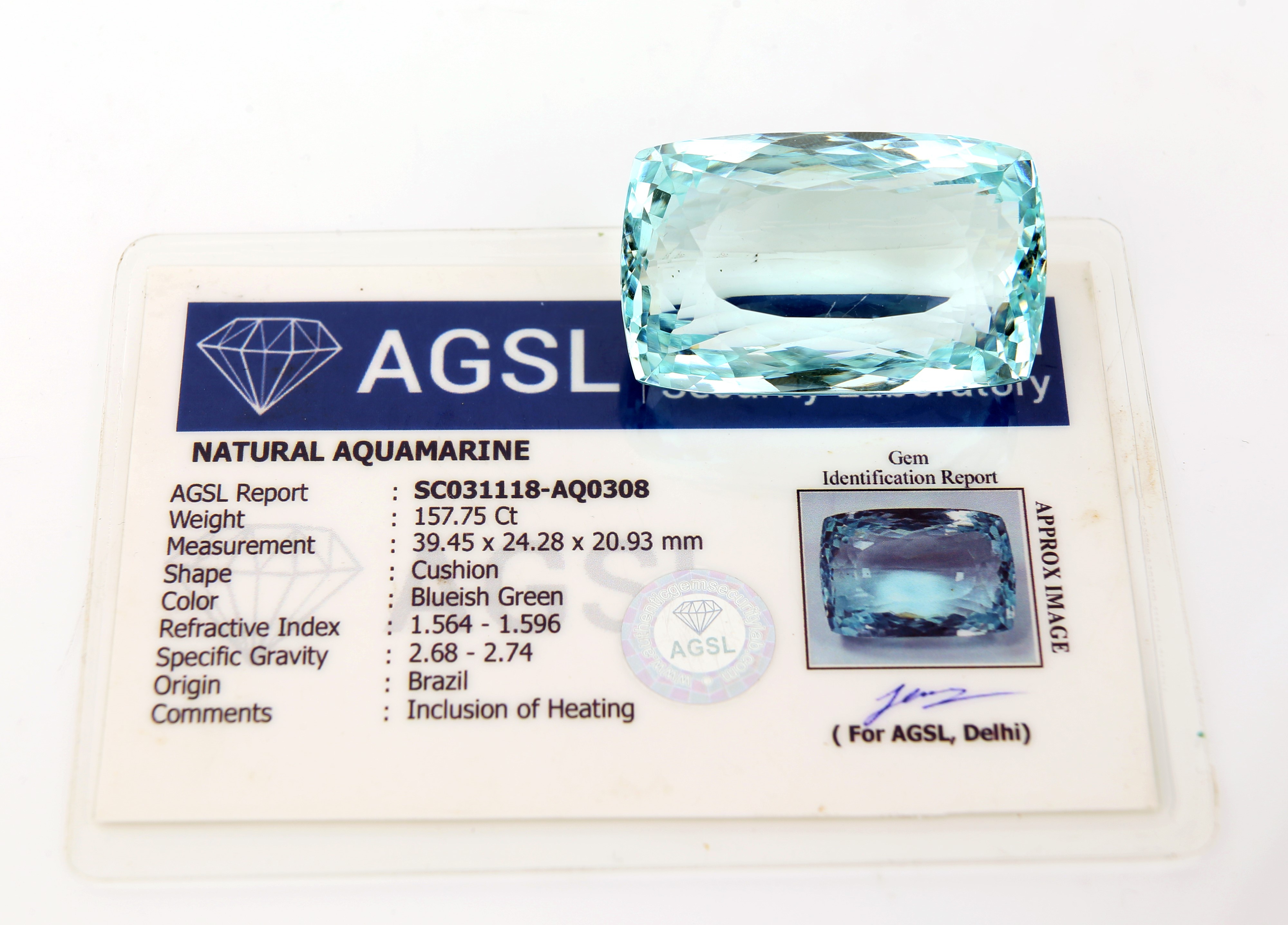 Acquamarina naturale ct. 157, 75. Origine Brasile, corredato di certificazione gemmologica AGSL.