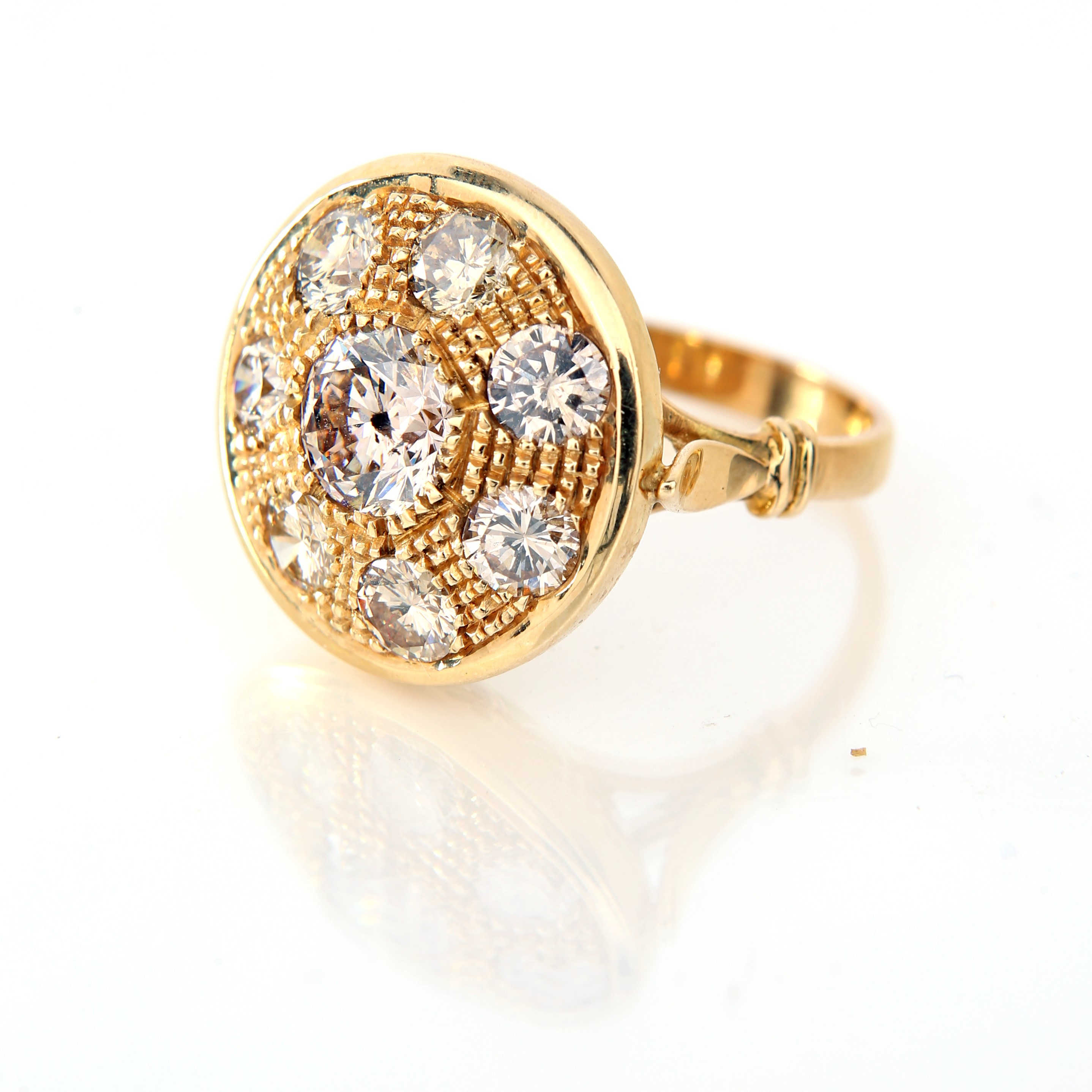 Oro giallo 750/000. Diamante centrale in taglio rotondo brillante ct. 1,25, diamanti in taglio rotondo brillante ct. 2,10. Peso complessivo gr. 8,40.
