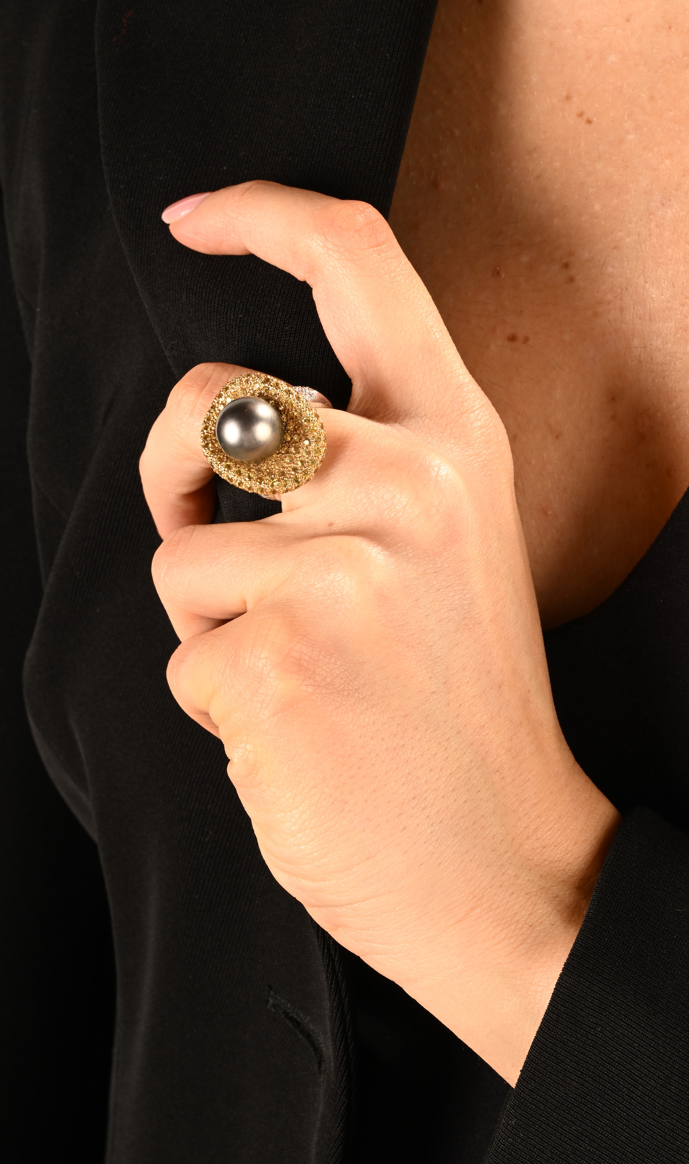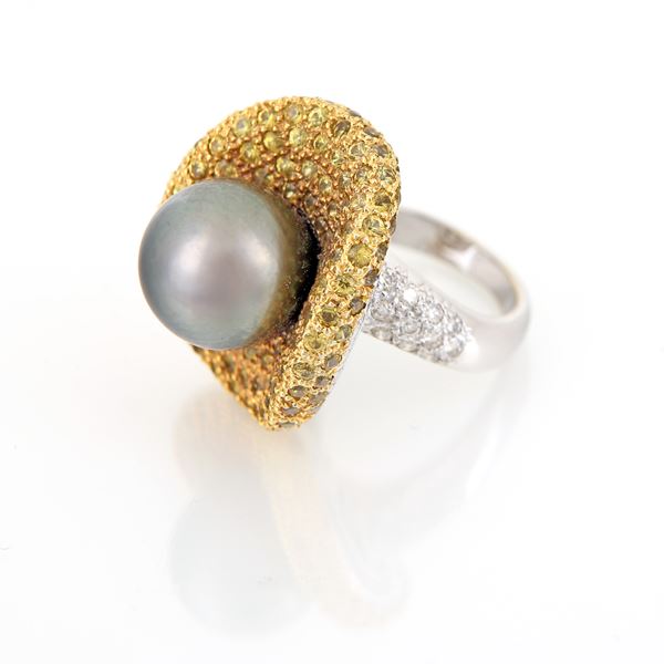 Anello in oro bianco, zaffiri gialli, brillanti e perla Tahiti
