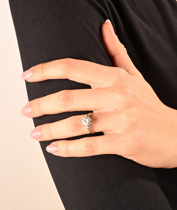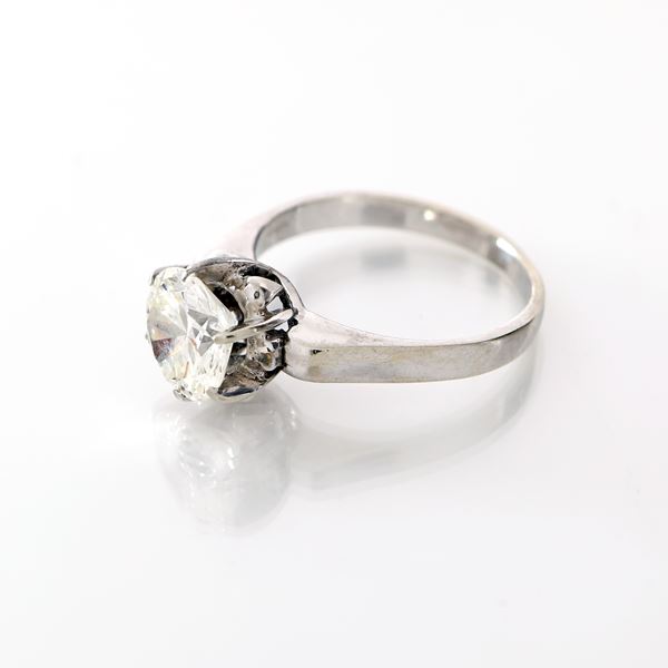 Oro bianco 750/000. Diamante in taglio rotondo brillante, ct. 1,40 ca, prob I-J, IF-VVS. Peso complessivo gr 3,40