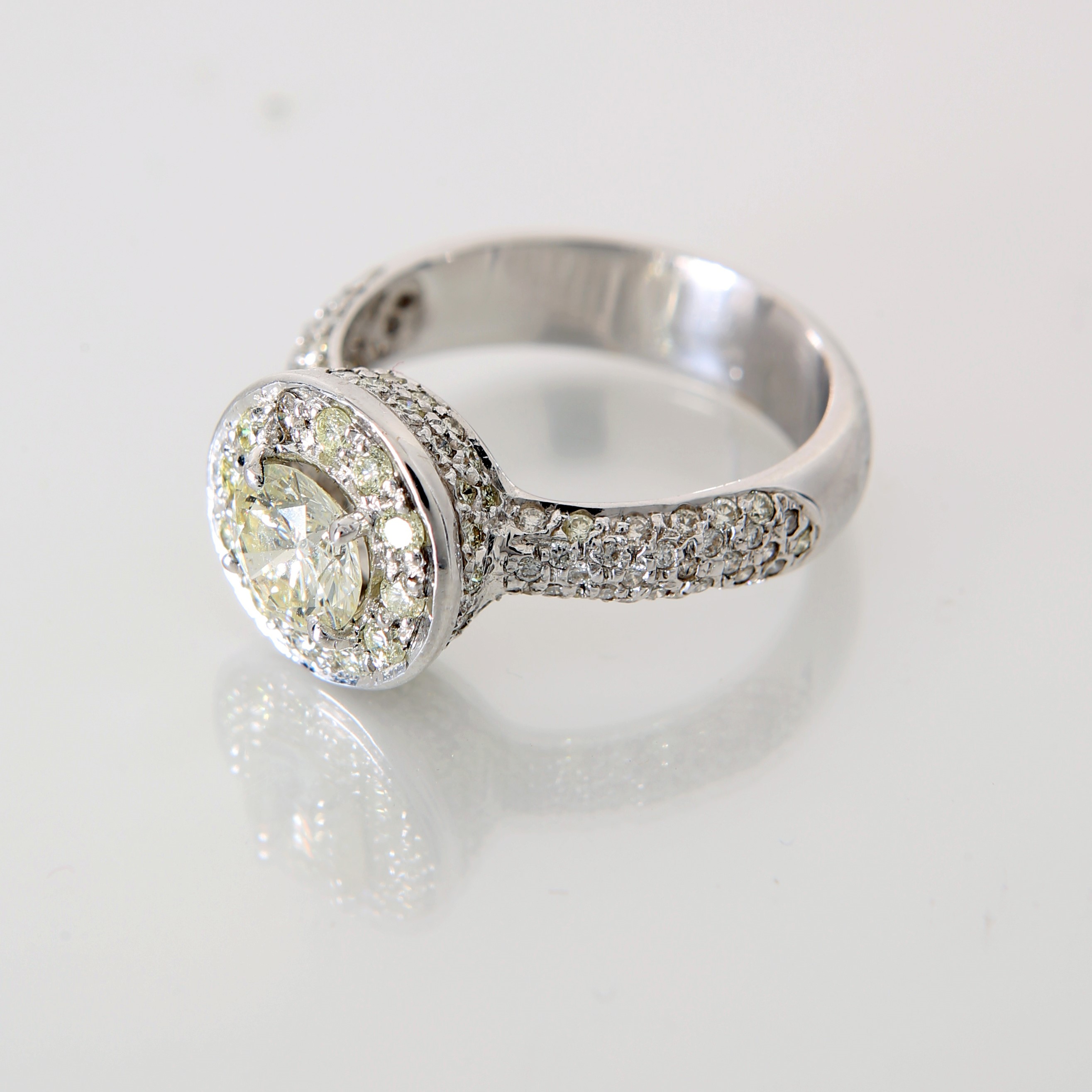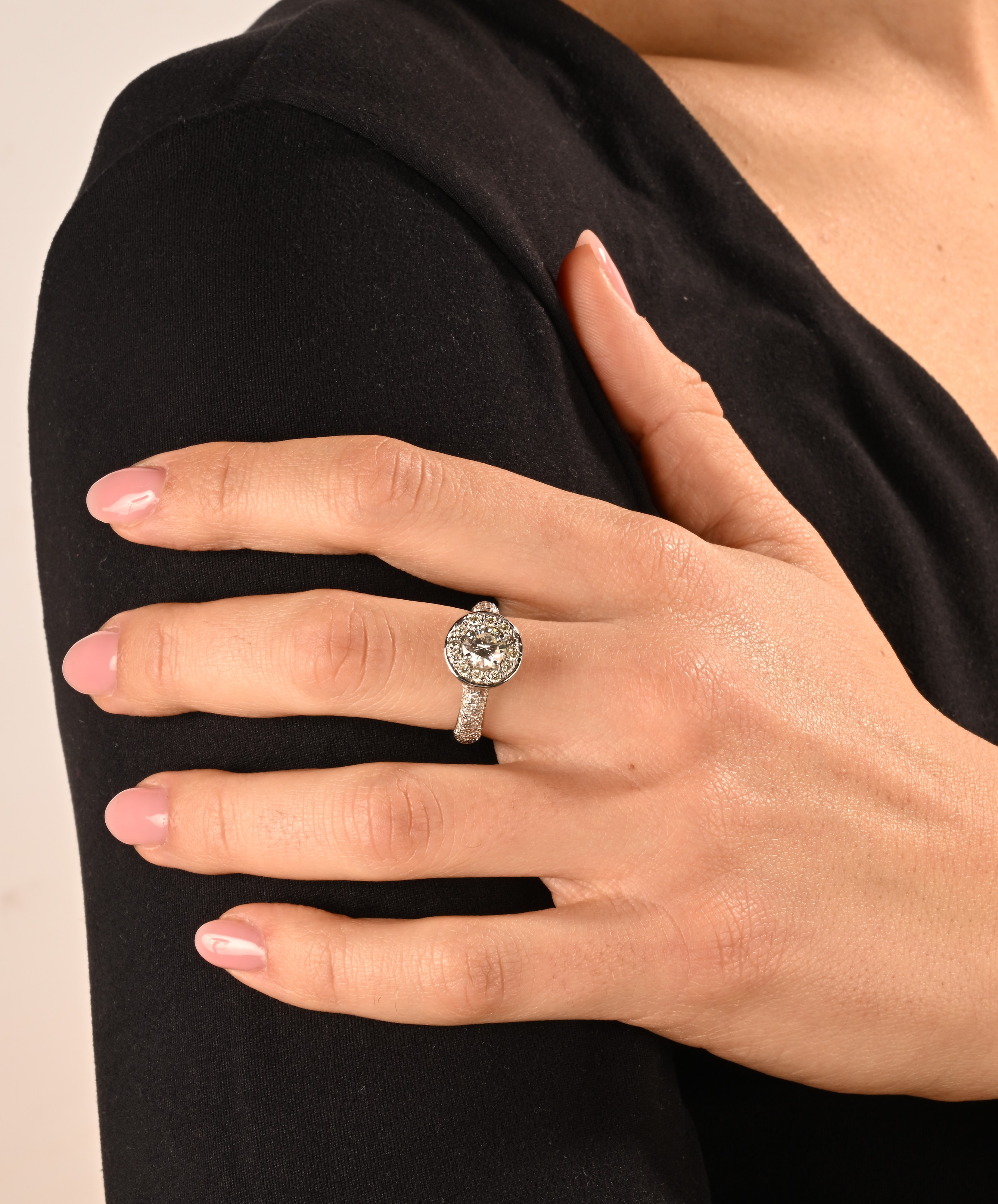 Oro bianco 750/000. Diamante centrale ct. 0,90 ca, diamanti in taglio rotondo brillante ct. 1,10. Peso complessivo gr. 6