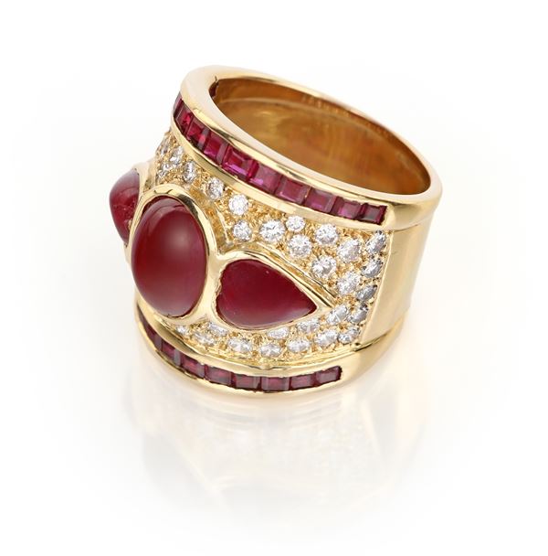 Anello in oro giallo 750/000. Diamanti in taglio rotondo brillante ct. 1,50, rubini in taglio carrè e cabochon ct. 4 ca. Peso complessivo gr. 14,80