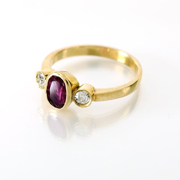 Oro giallo 750/000. Rubino naturale in taglio ovale, diamanti in taglio rotondo brillante. Peso complessivo gr. 3,40