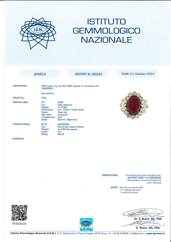 Oro bianco 750/000. Rubino in forma ovale, taglio cabochon ct 12,60, BURMA, MYANMAR, SENZA INDICAZIONE DI TRATTAMENTO TERMICO. Diamanti in taglio rotondo brillante e navette ct 4,20, H-I, VS-SI. Peso complessivo gr 9,10. Corredato di certificazione gemmologica IGN n° 36233 del 21/10/2024