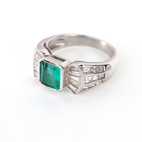 Oro bianco 750/000. Smeraldo in taglio smeraldo ct. 1,50 ca, diamanti in taglio tepper e carrè ct. 1,30 ca., prob F-G, VVS-VS. Peso complessivo gr. 7,20