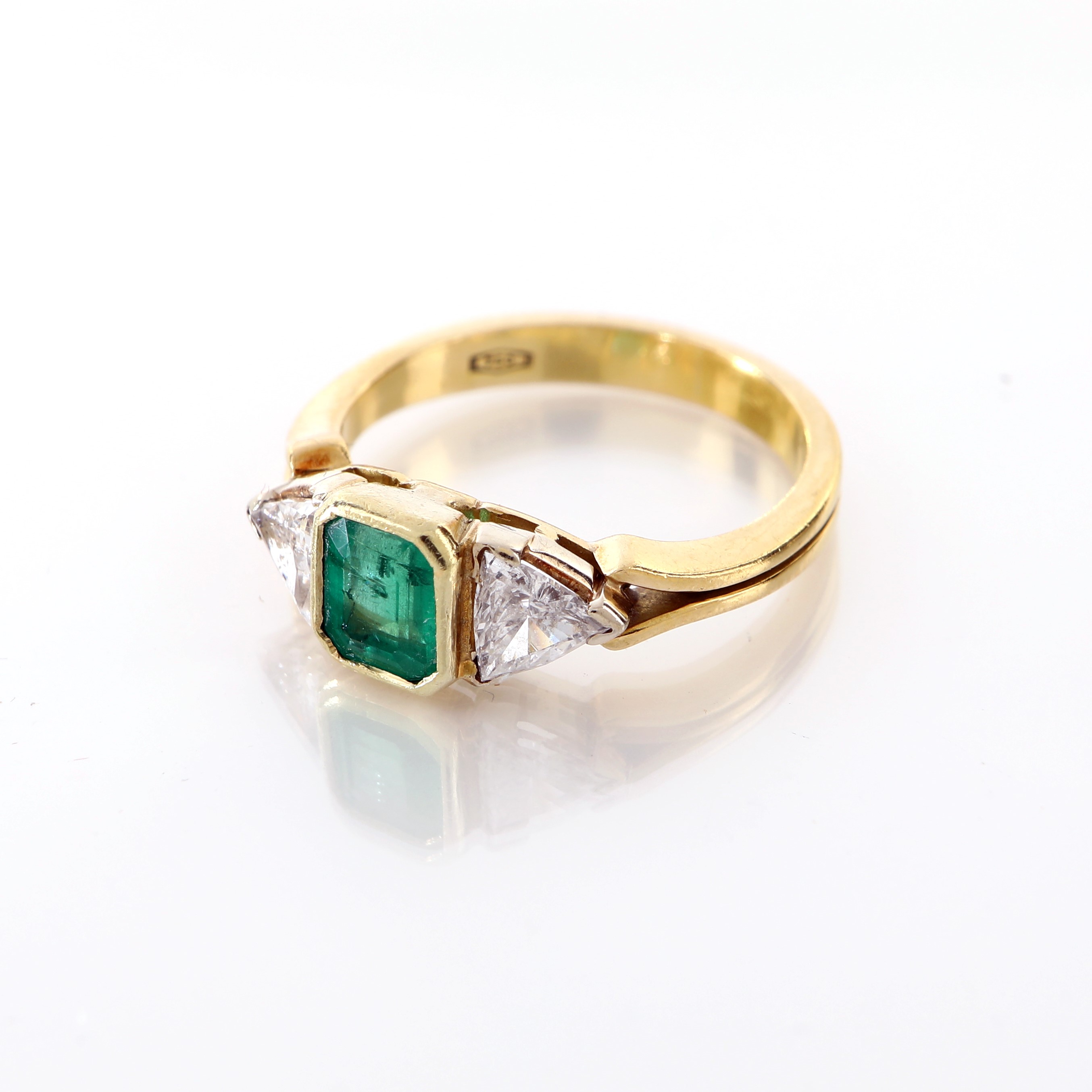 Oro giallo 750/000. Smeraldo in taglio smeraldo, diamanti in taglio triangolo ct. 1 ca. Peso complessivo gr. 4,30
