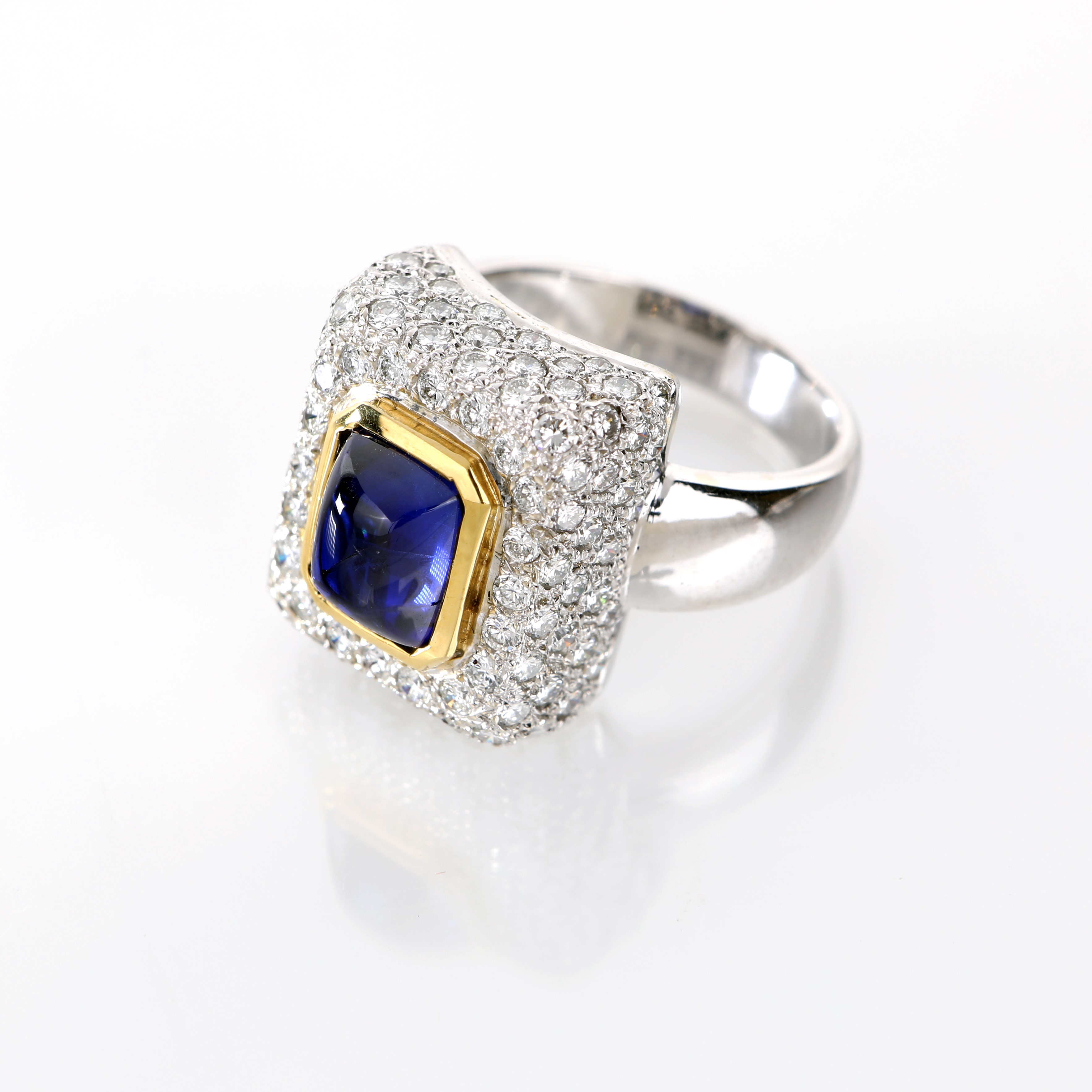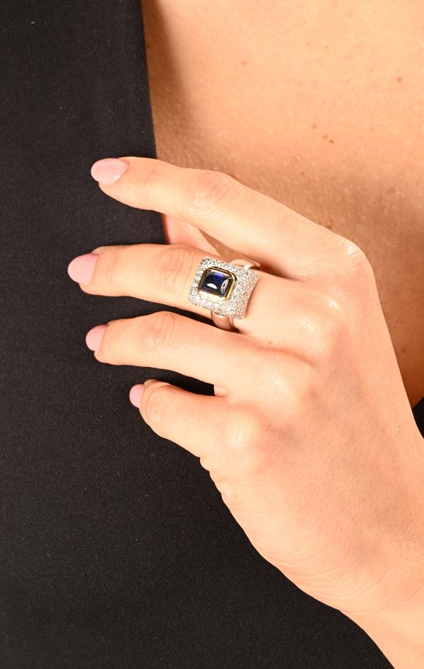 Oro bianco 750/000. Zaffiro in taglio sugar loaf ct. 3 ca., diamanti in taglio rotondo brillante ct. 1,80 ca. Peso complessivo gr. 12,50