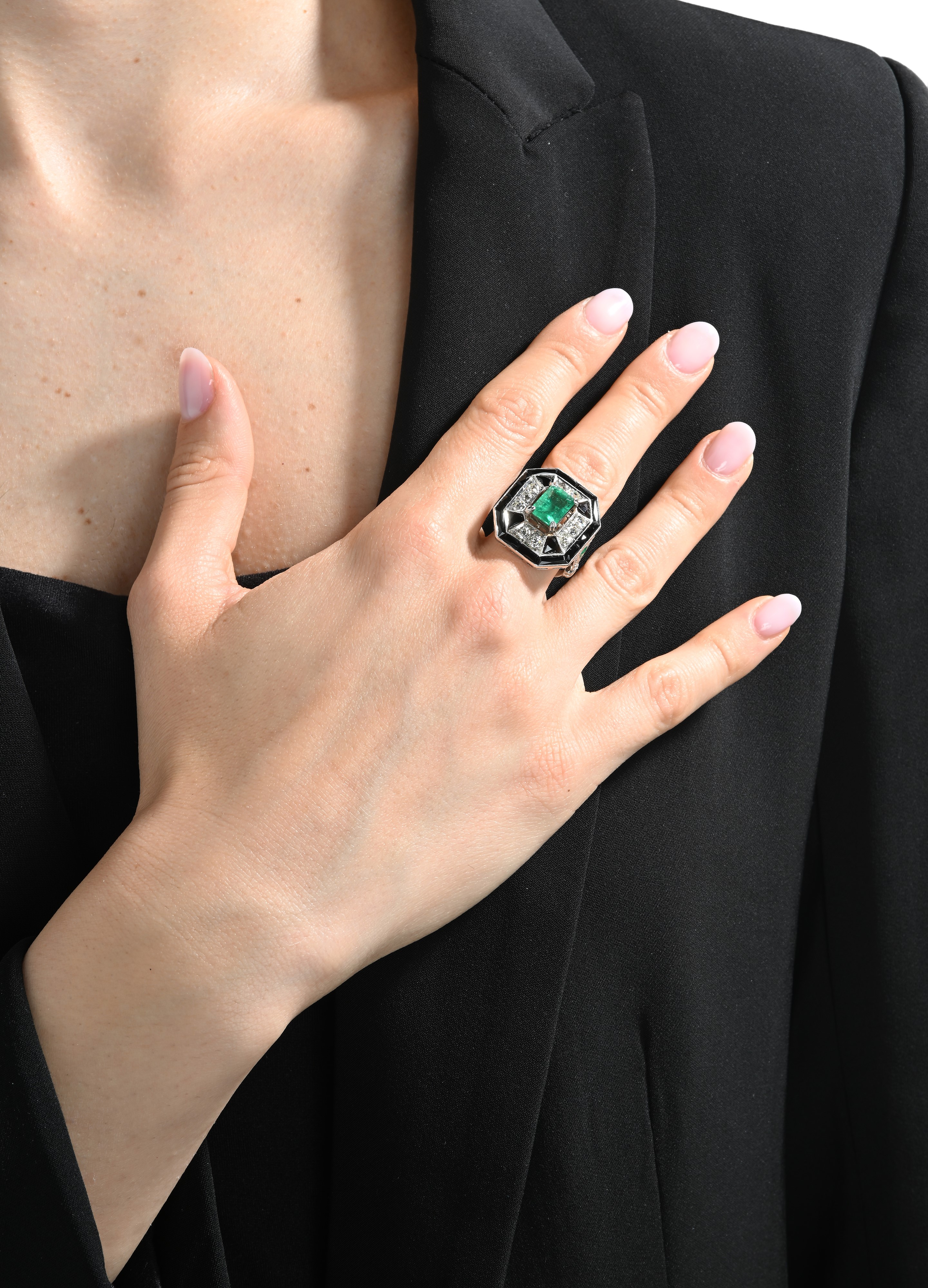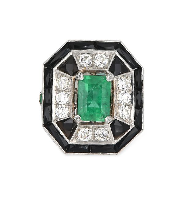 Anello in platino, smeraldi onice e brillanti
