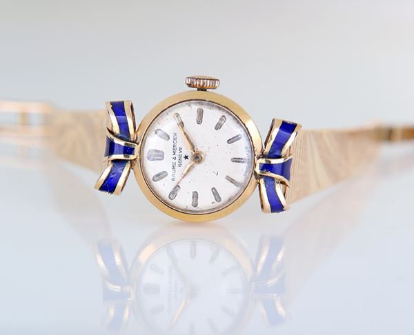 Oro giallo 750/000. Cassa n° 13245, bracciale incorporato in oro 750/000 e decorato a smalto blu, fondello a scatto. Quadrante argentato con indici applicati. Movimento manuale, bilanciere monometallico con viti, spirale piana. Accessori: astuccio Baume & Mercier Peso complessivo gr. 21,80