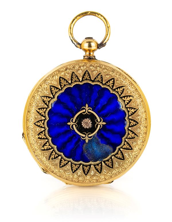Oro giallo 750/000. Cassa n. 47673 decorata con incisioni e smalto blu traslucido su disegno guilloché; al centro presenta un motivo floreale con rosette incastonate. Quadrante in smalto bianco, numeri romani. Movimento con carica a chiavetta, scappamento a cilindro.