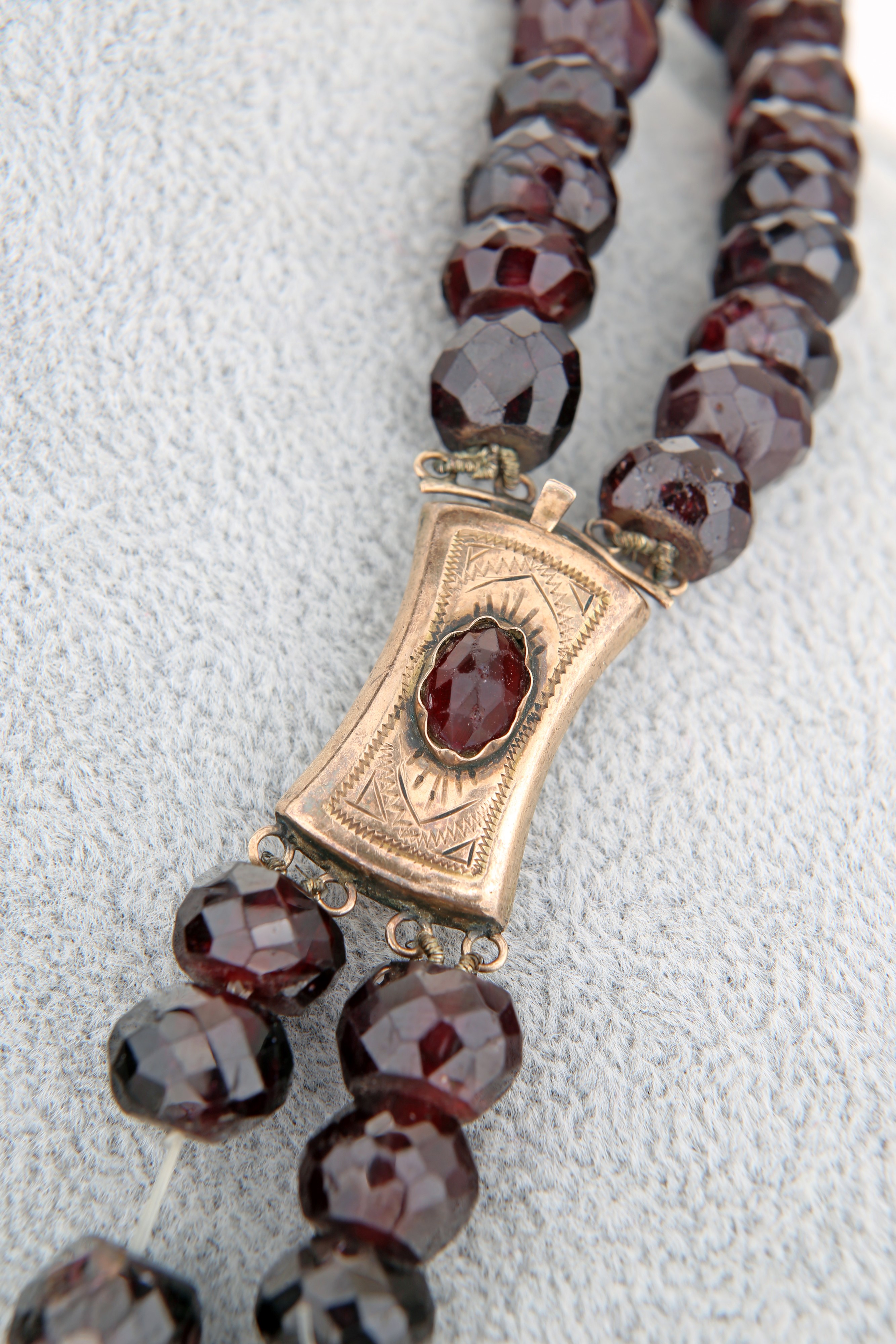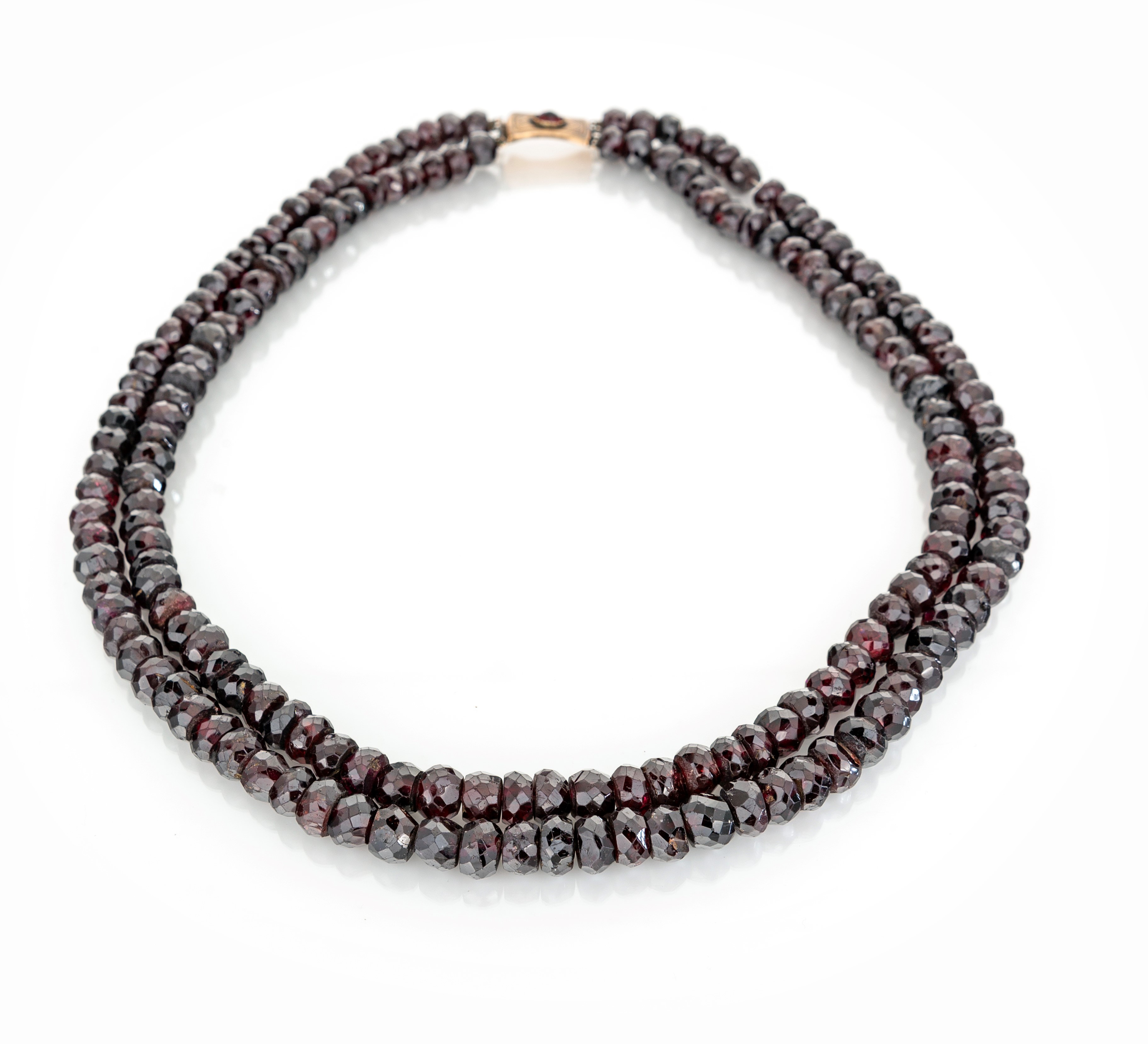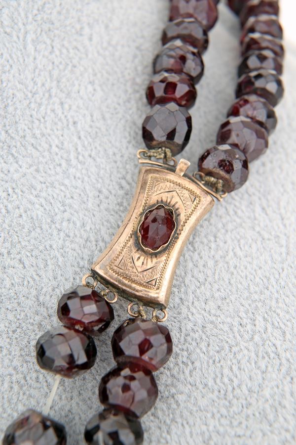 Oro a basso titolo. Granati in taglio briolette mm. 9. Peso complessivo gr. 211.