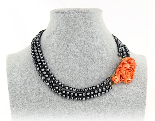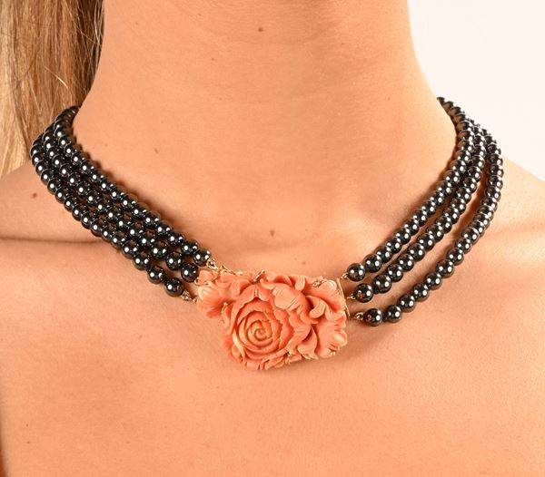 Collana in oro, corallo ed ematite