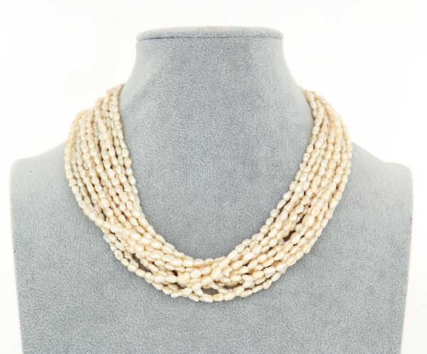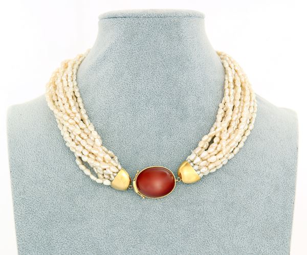 Collana in oro, perle d'acqua dolce e corniola