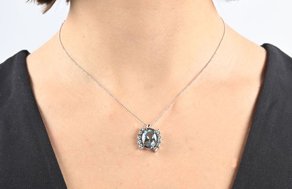 Oro bianco 750/000, peso complessivo gr. 7,7. Acquamarina ct. 4,20 ca, brillanti ct. 0,50 ca.