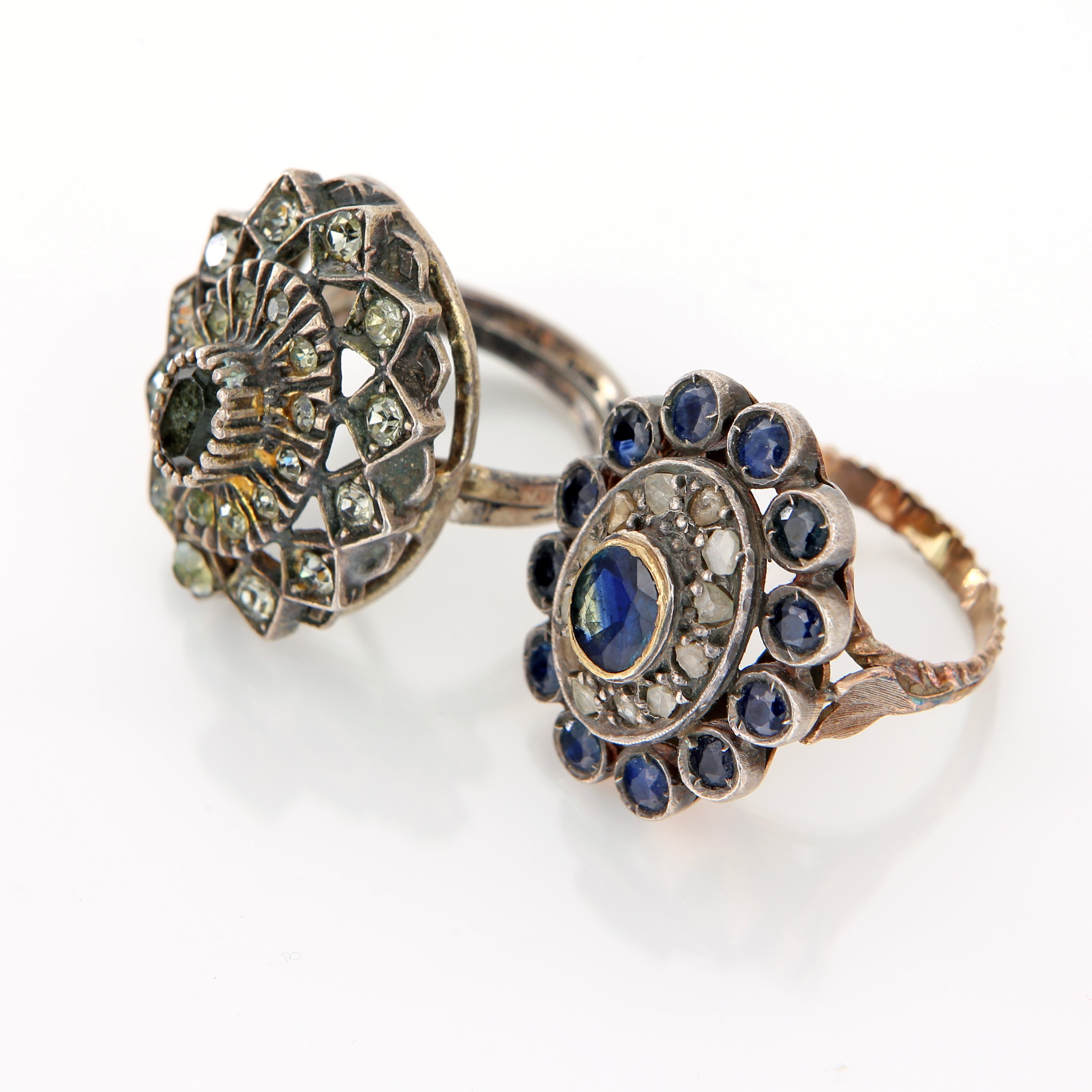 Coppia di anelli antichi in oro, argento, diamanti, zaffiri e pietre incolori