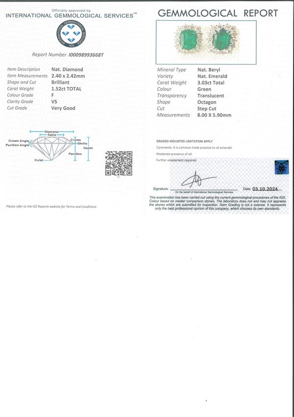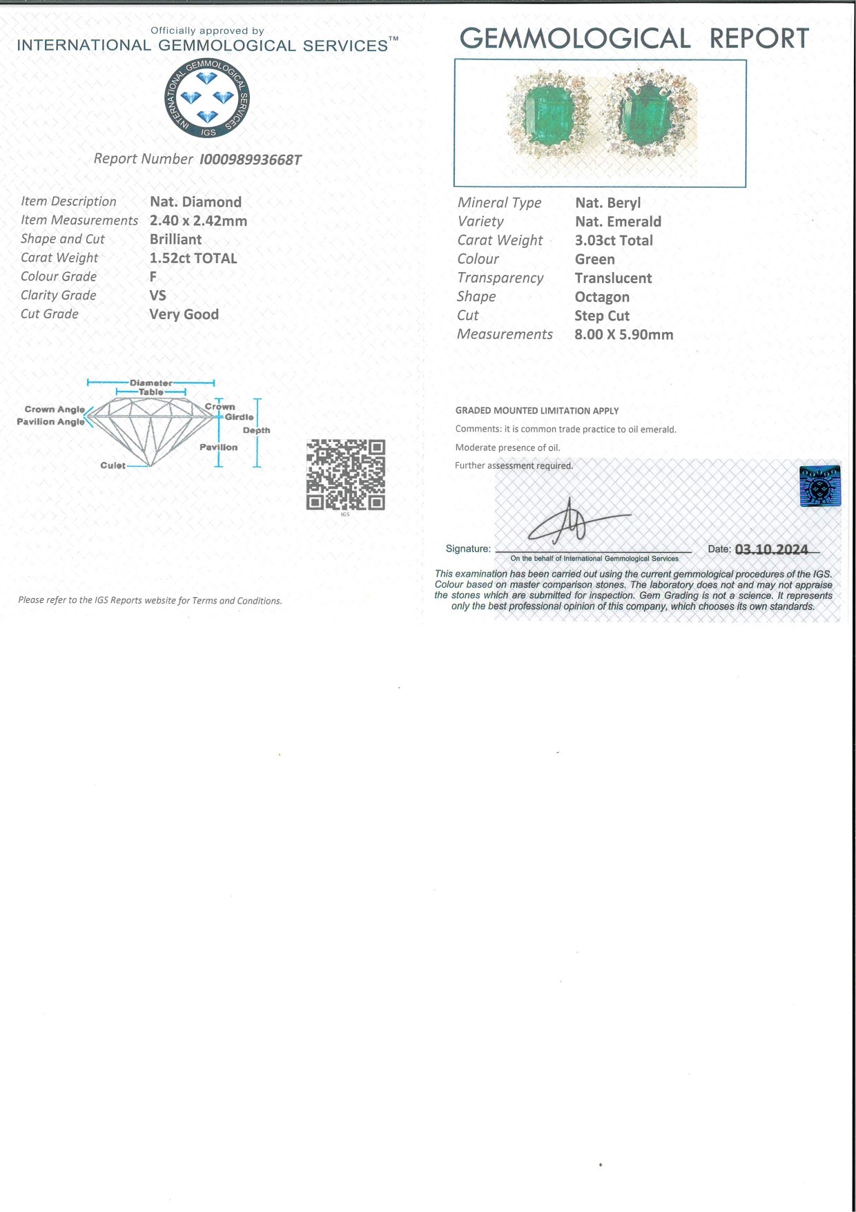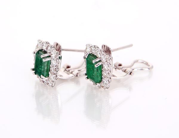 Oro bianco 750/000. Smeraldi in taglio smeraldo ct. 3,03, diamanti in taglio rotondo brillanti ct. 1,52, F- VS. Peso complessivo gr. 6,80. Corredati di certificazione gemmologica.