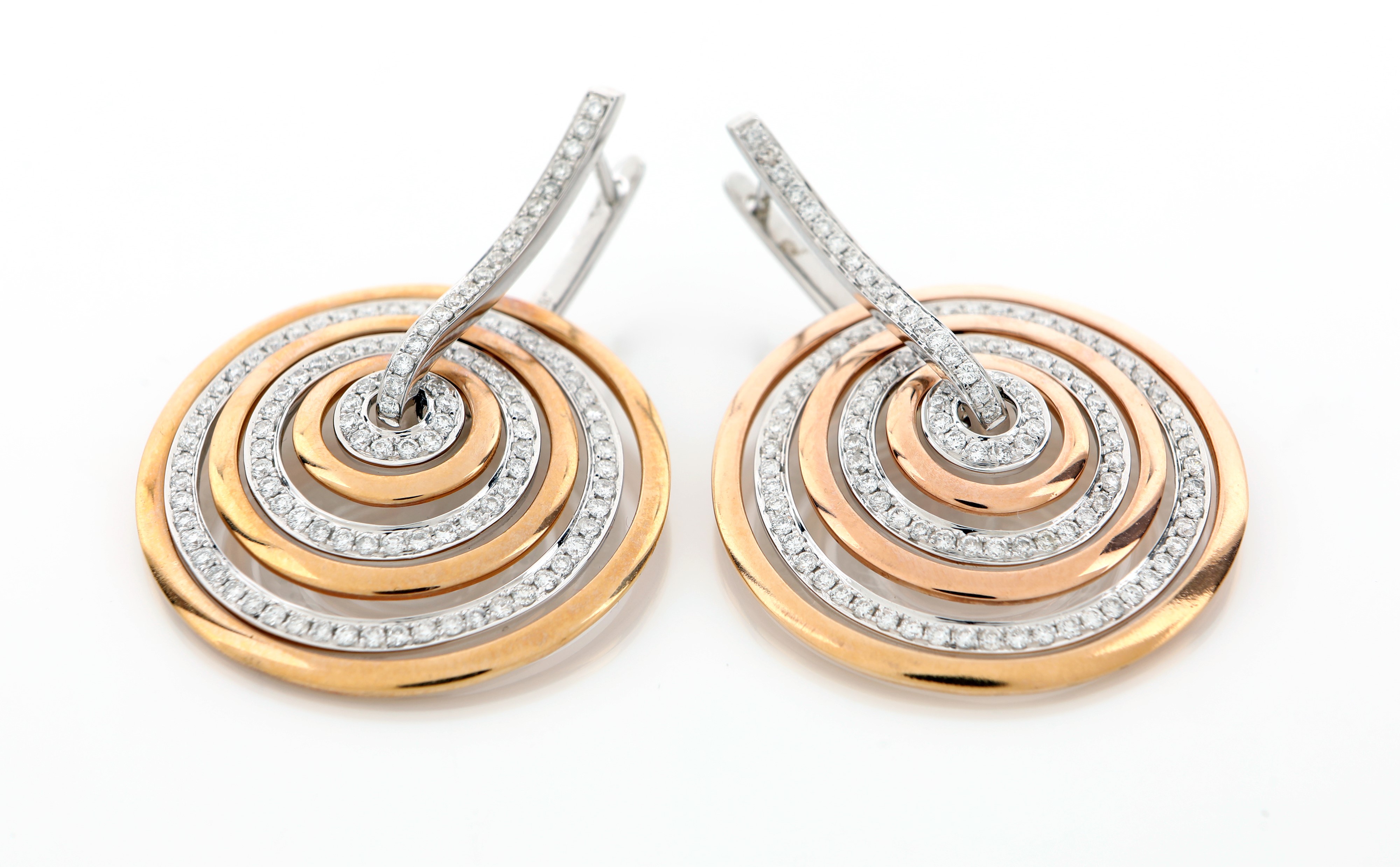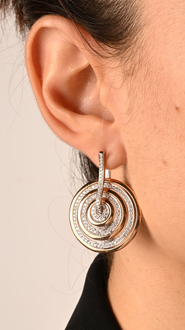 Coppia di orecchini pendente a cerchi concentrici in oro e brillanti