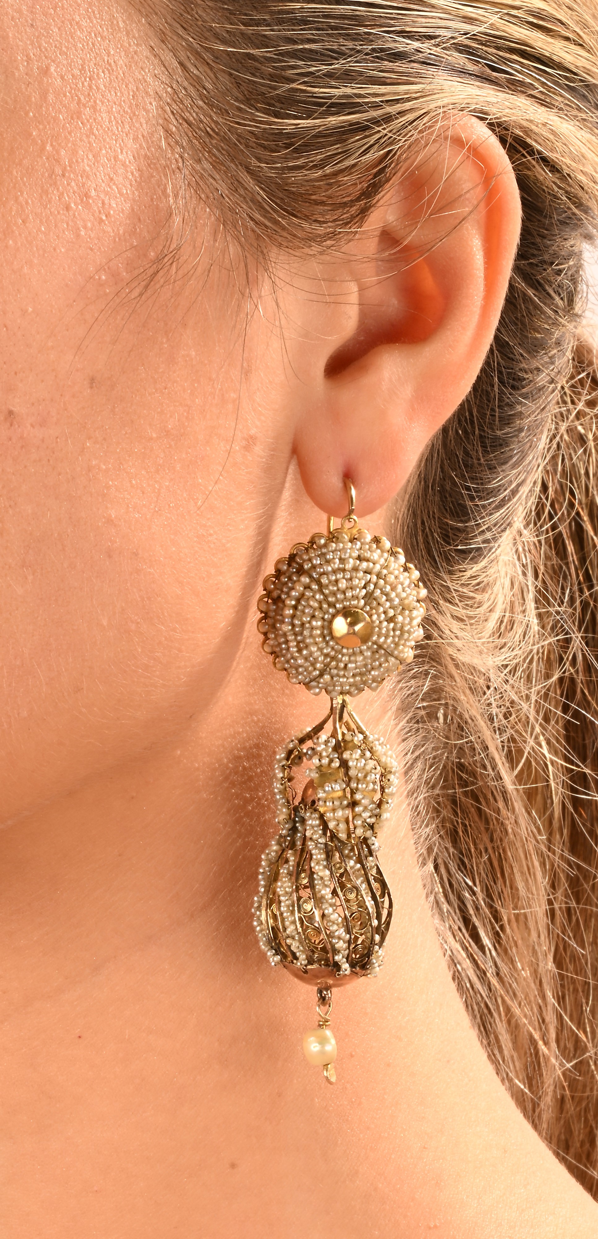 Coppia di orecchini pendenti, antichi, con pendente intercambiabile in oro e microperle, Sicilia inizio XIX secolo
