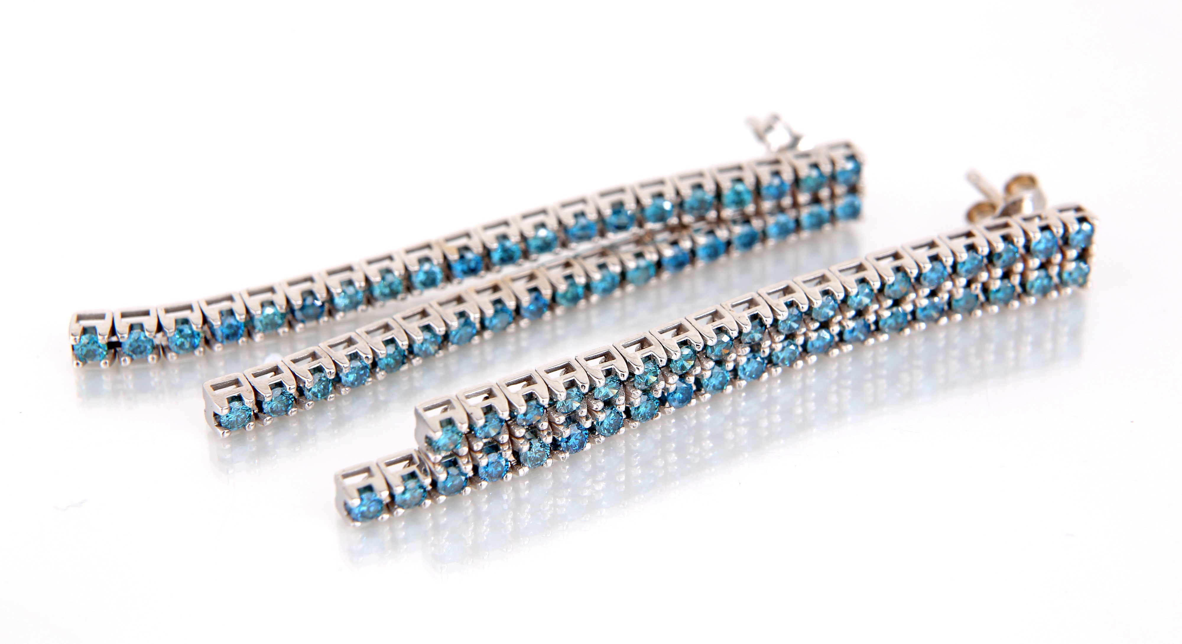 Oro bianco 750/000. Diamanti in taglio rotondo brillante, fancy blu ct. 3 ca. Peso complessivo gr. 11.