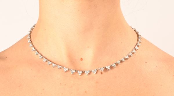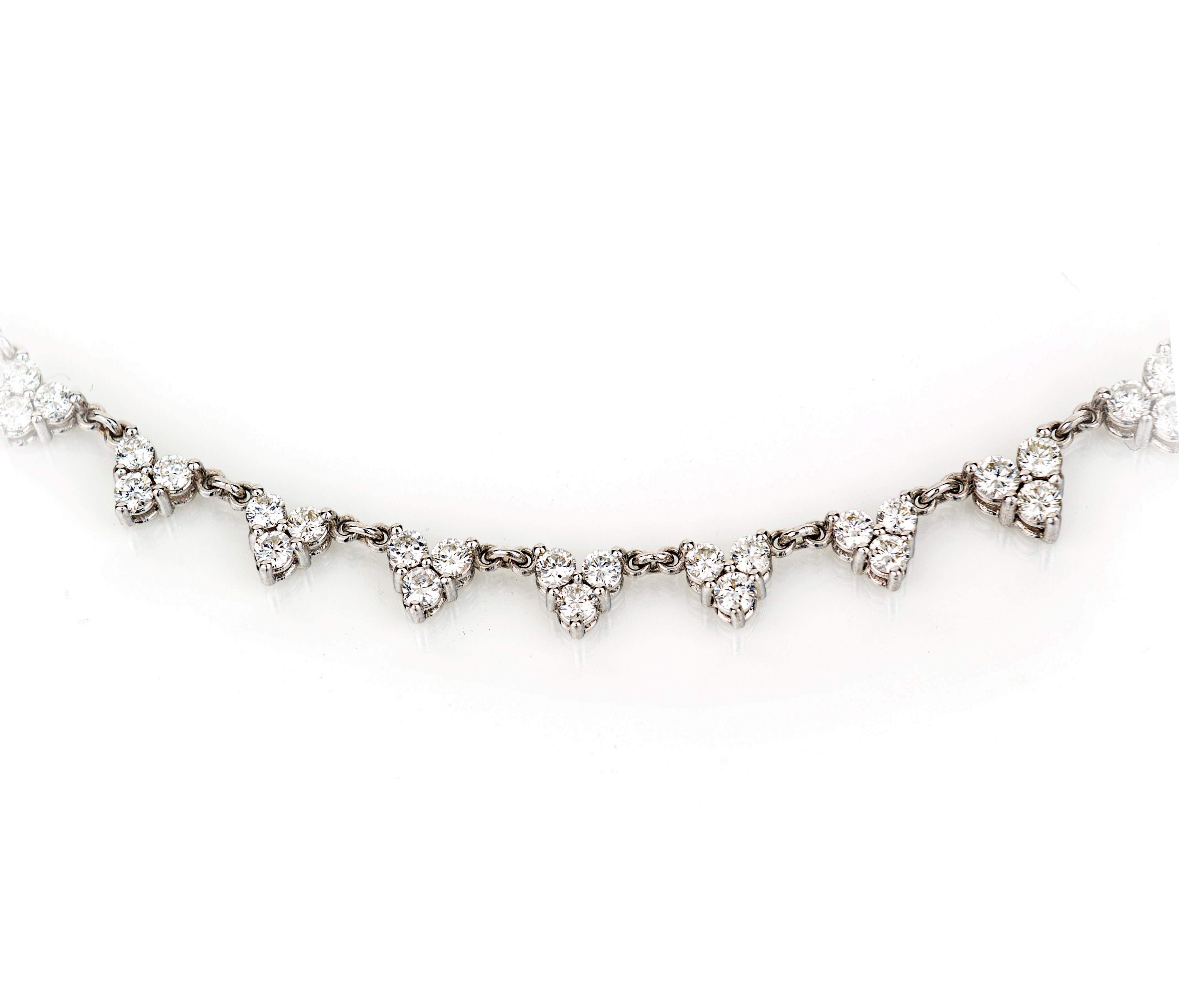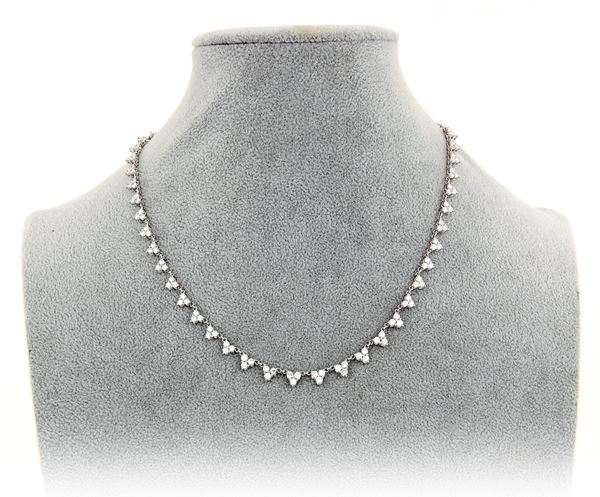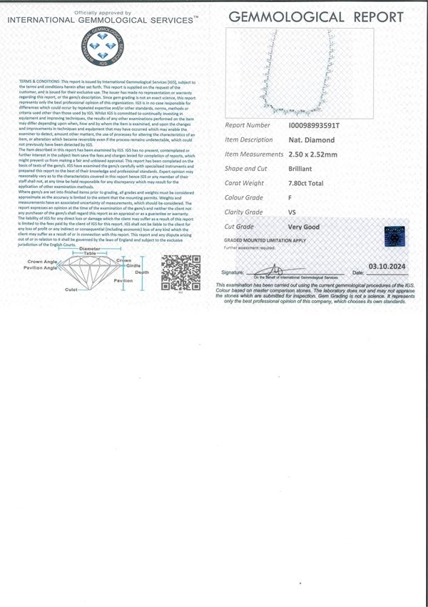 Oro bianco 750/000. Diamanti in taglio rotondo brillanti ct. 7,80. F- VS. Peso complessivo gr. 17,80. Corredato di certificazione gemmologica.