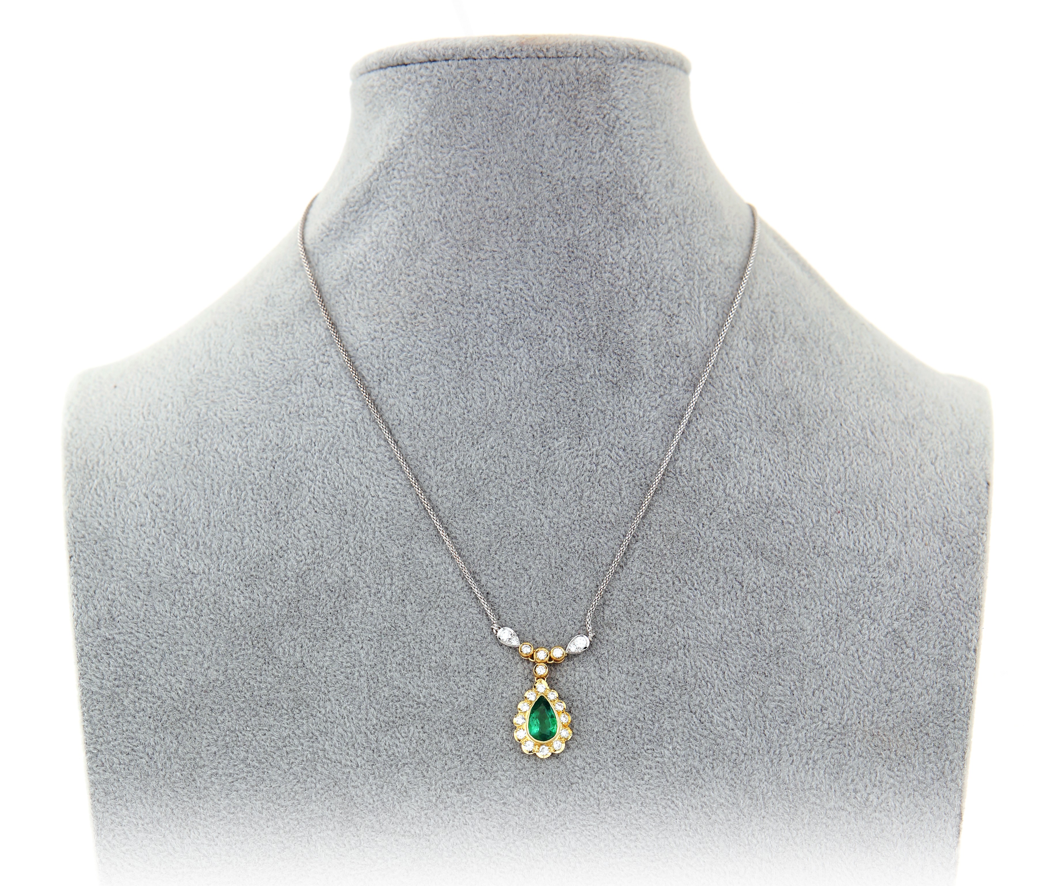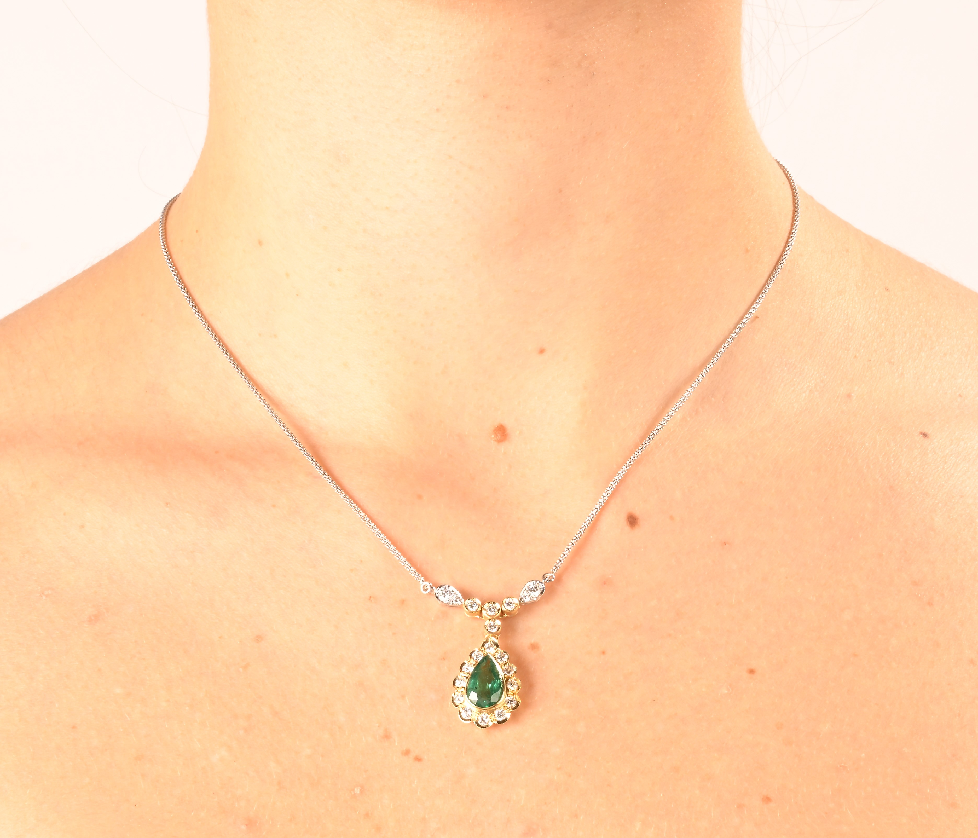 Oro bianco e giallo 750/000. Smeraldo in taglio goccia ct. 2 ca, diamanti in taglio rotondo brillanti ct. 1 ca. Peso complessivo gr. 6,20.