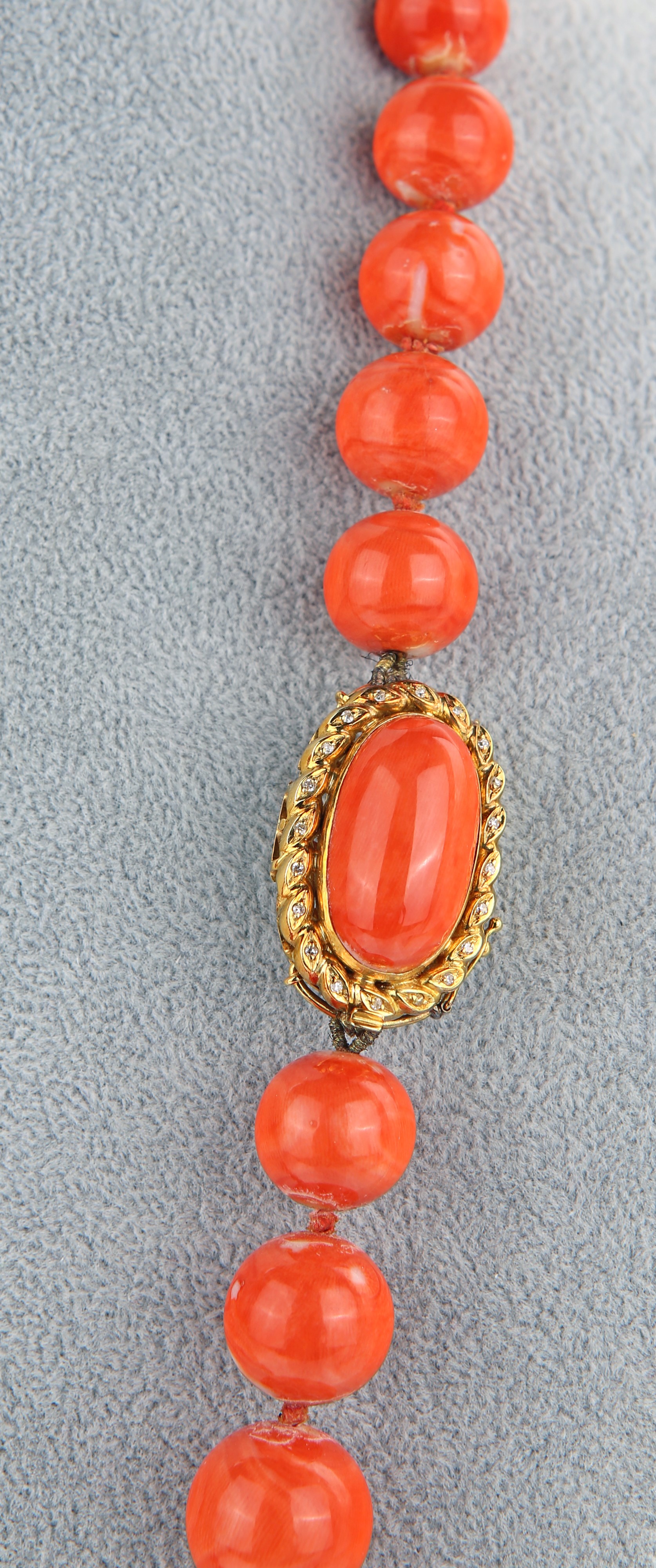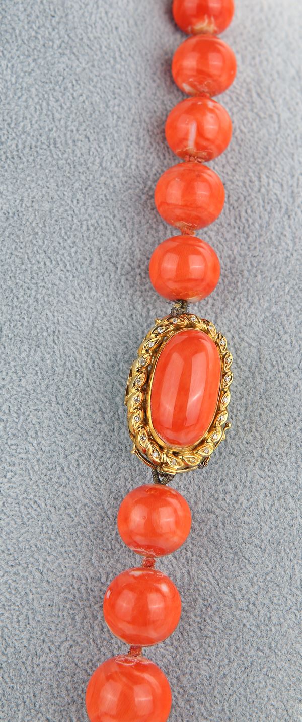 Grande collana in corallo in taglio sferico, oro e brillanti