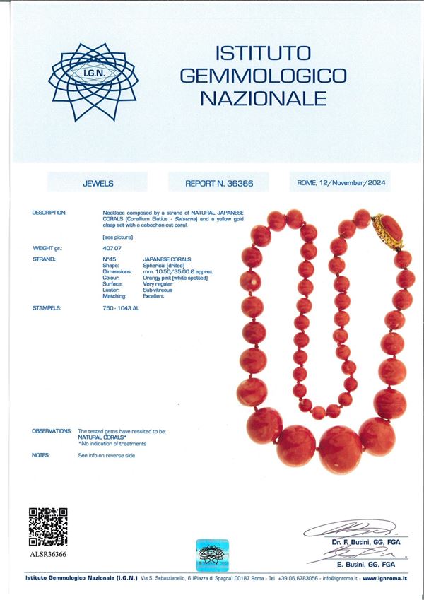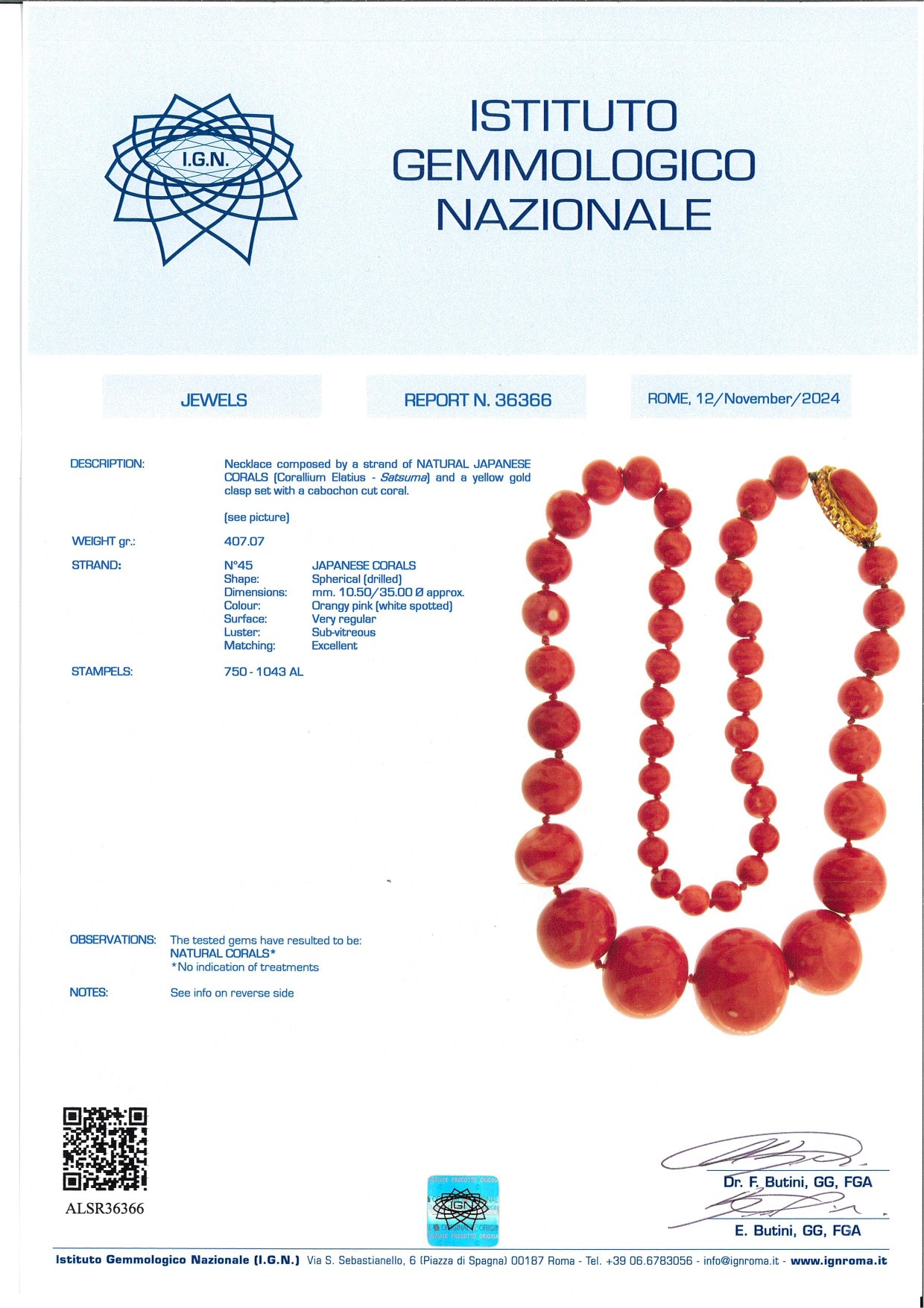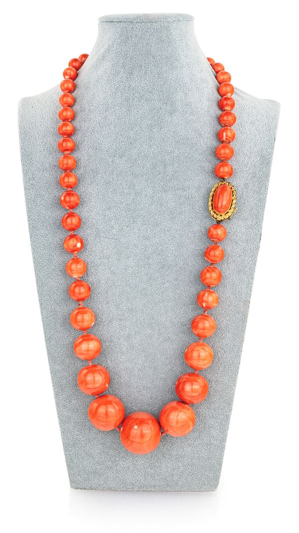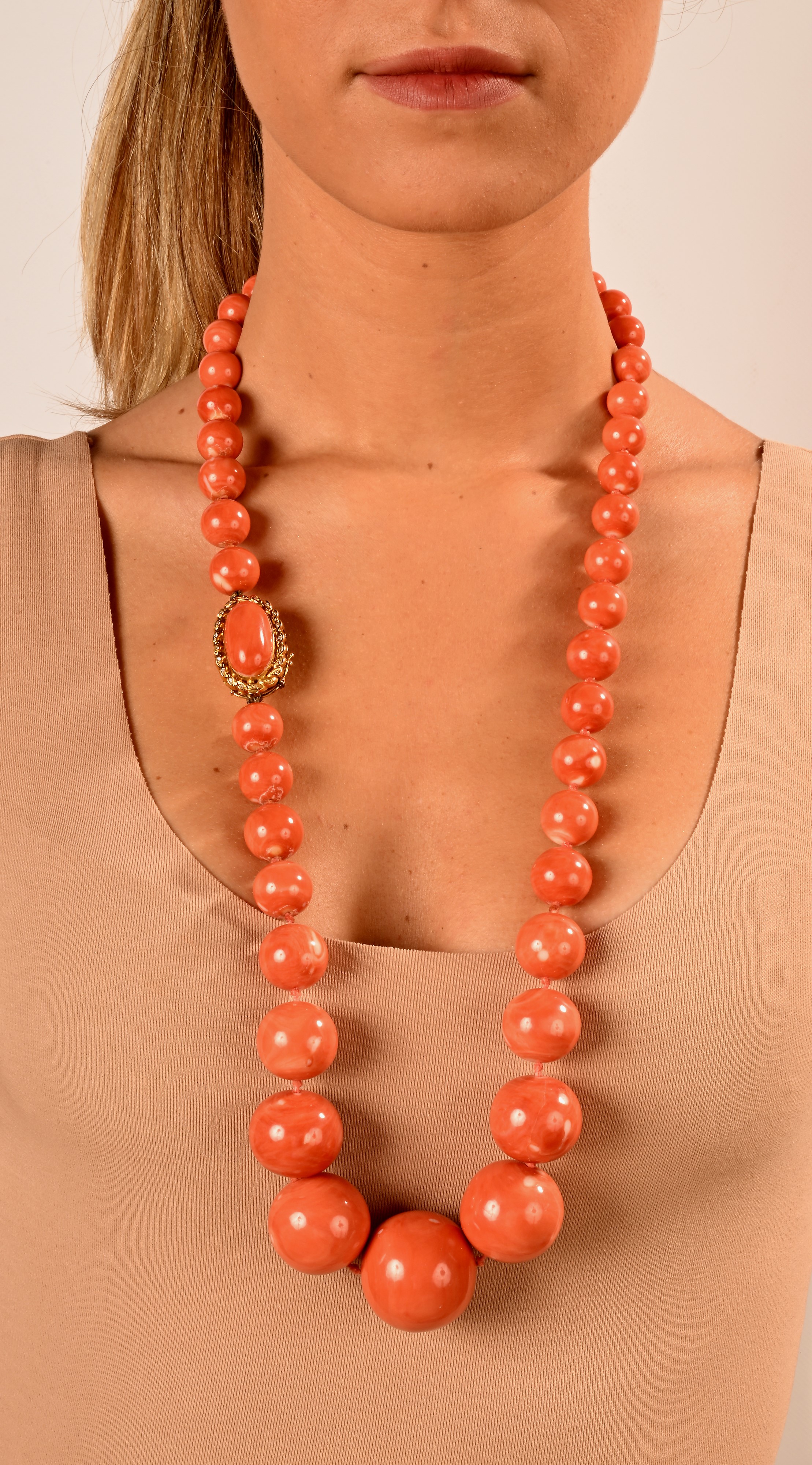 Oro giallo 750/000, diamanti in taglio rotondo brillante ct. 0,20 ca. Corallo in taglio sferico a gradazione da mm. 10.5 a mm. 35. Peso complessivo gr. 407,07.