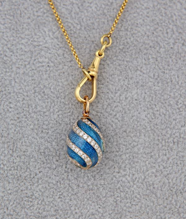 Lunga collana maglia in oro con pendente ad ovetto in argento e smalti