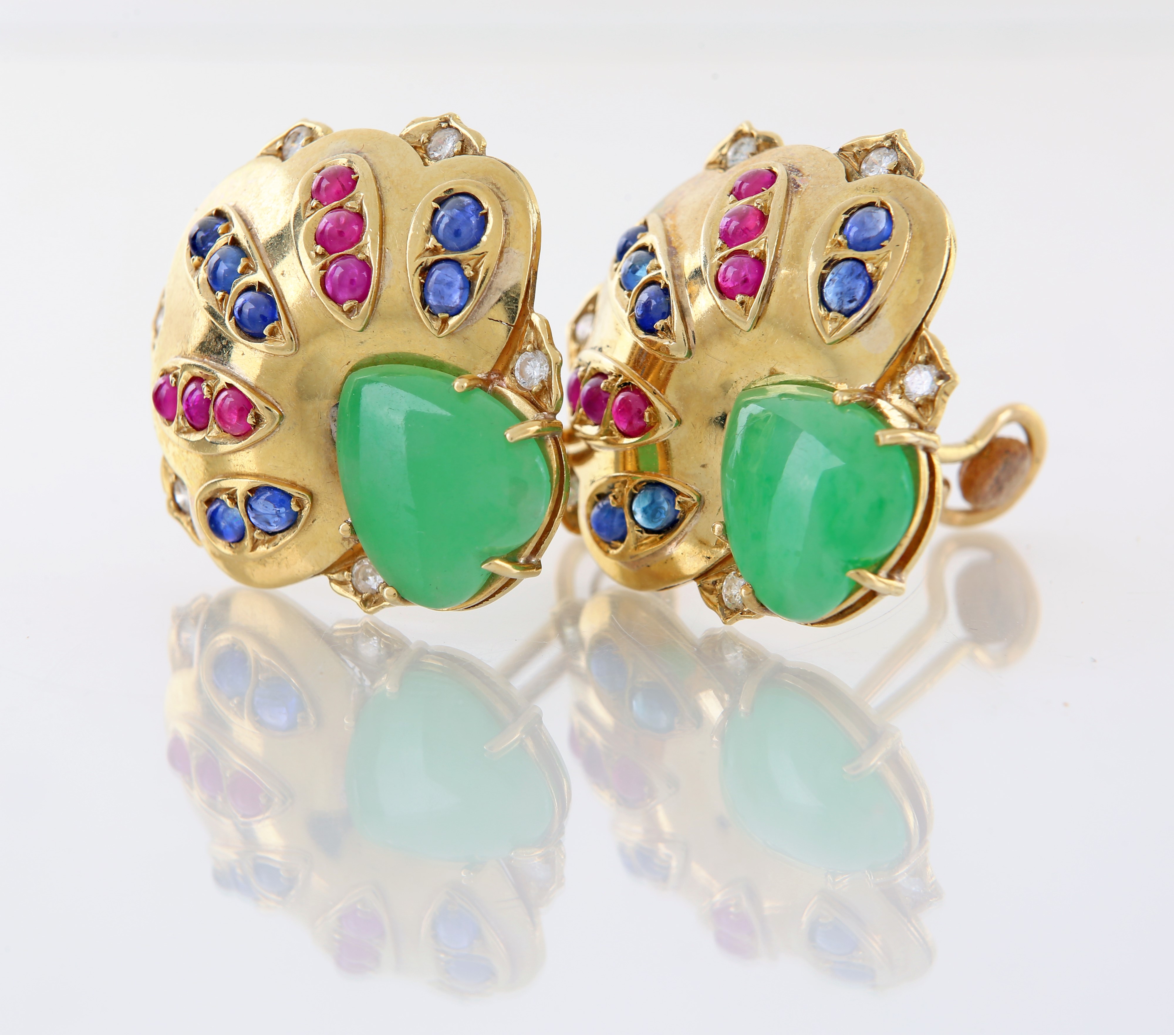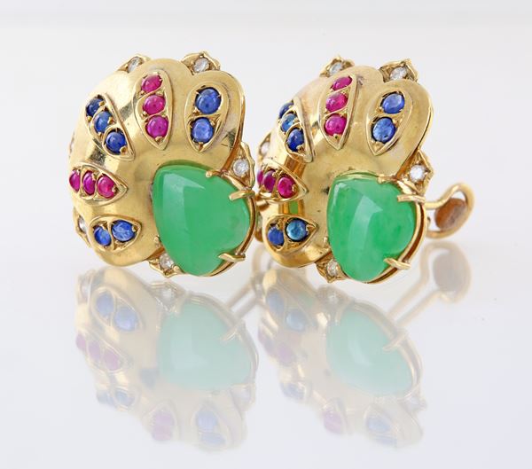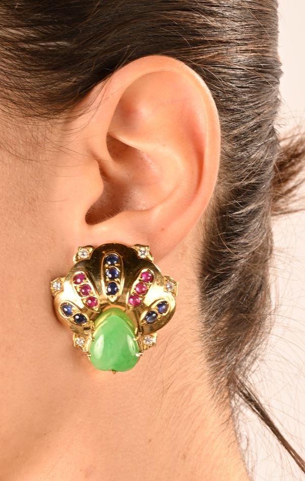 Moroni, coppia di orecchini in oro, giade, zaffiri, rubini e brillanti