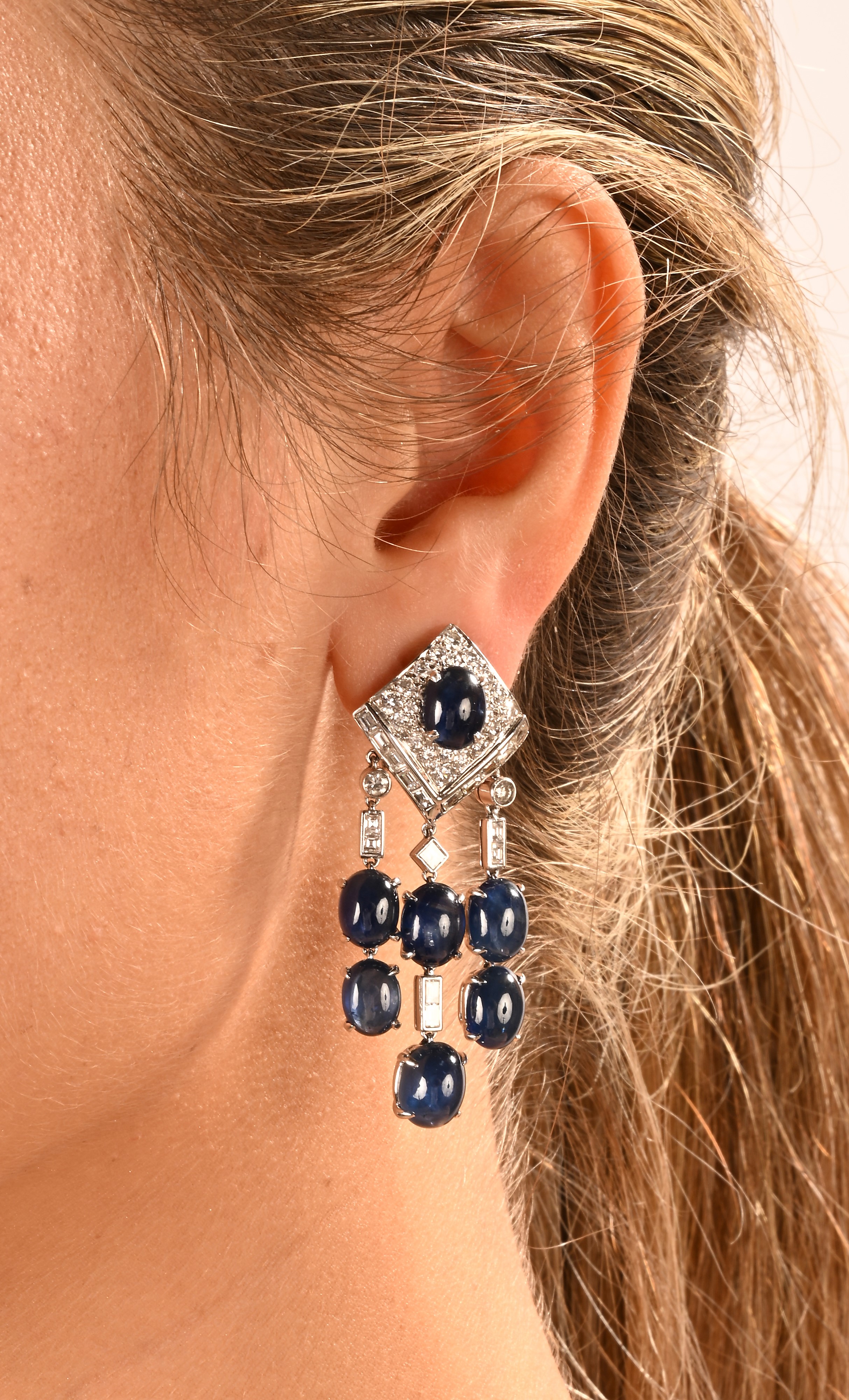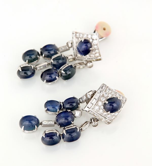 Oro bianco 750/000. Zaffiri in taglio cabochon ct. 11, diamanti in taglio rotondo brillante e baguettes ct. 3. Peso complessivo gr. 34,50