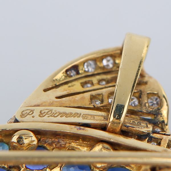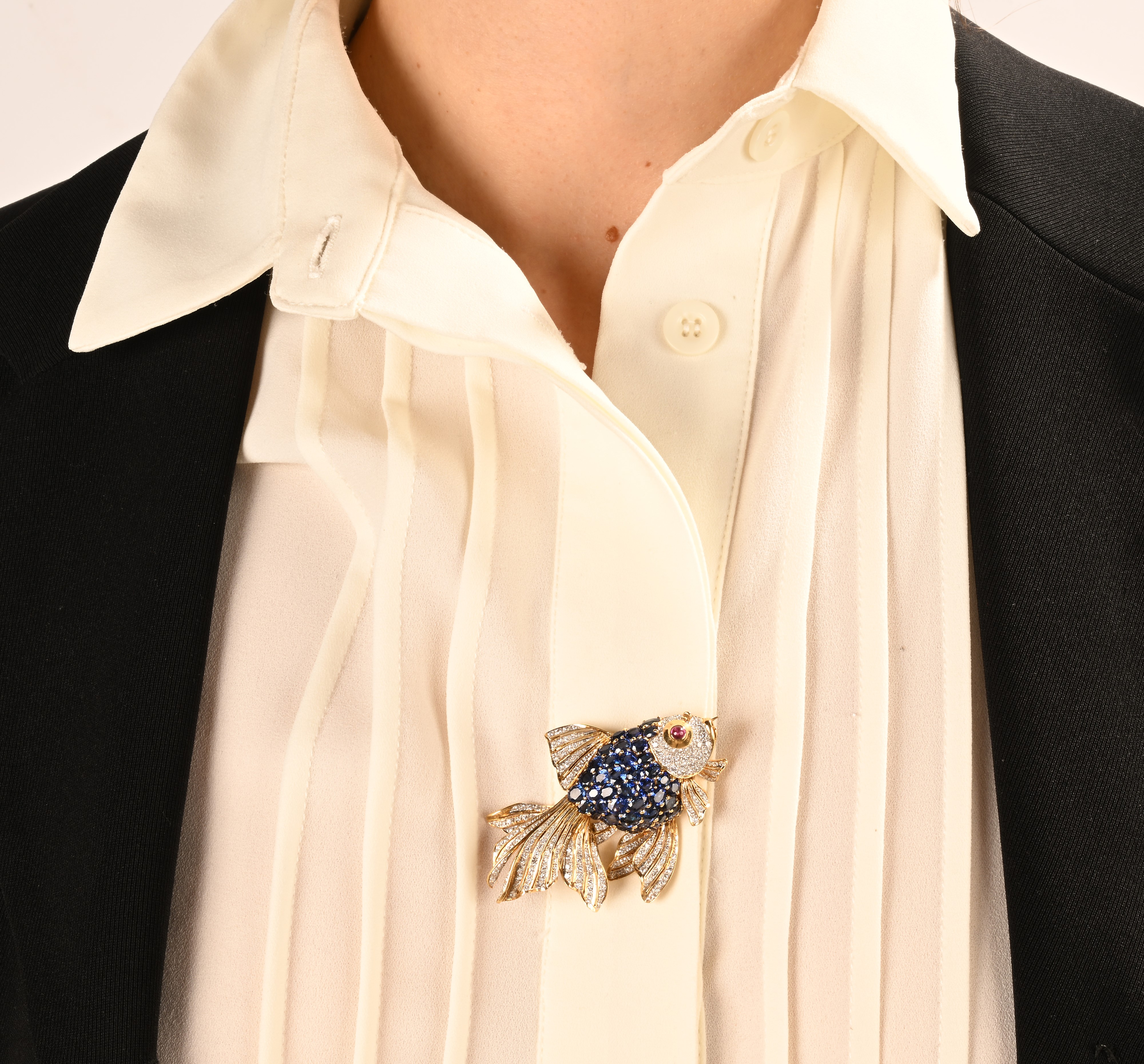 Paolo Piovan spilla pendente a foggia di pesce in oro, brillanti, zaffiri e rubino
