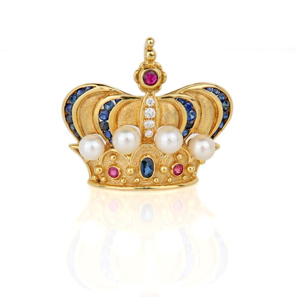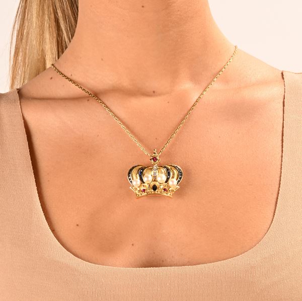 Pendente a corona con catena in oro, perla, diamanti, zaffiri e rubini