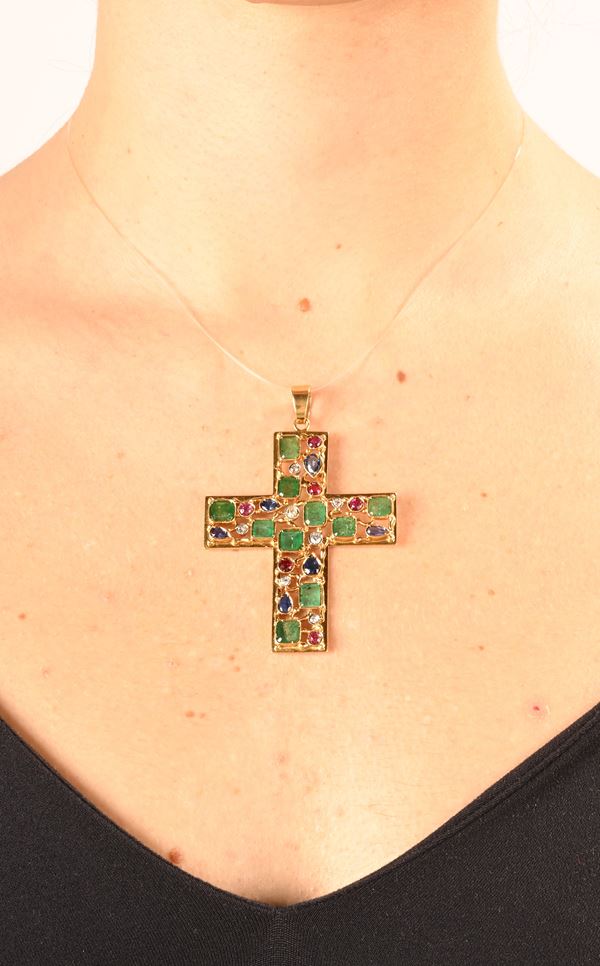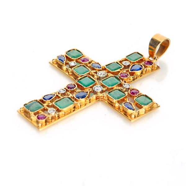 Pendente a croce in oro, smeraldi, zaffiri, rubini e brillanti