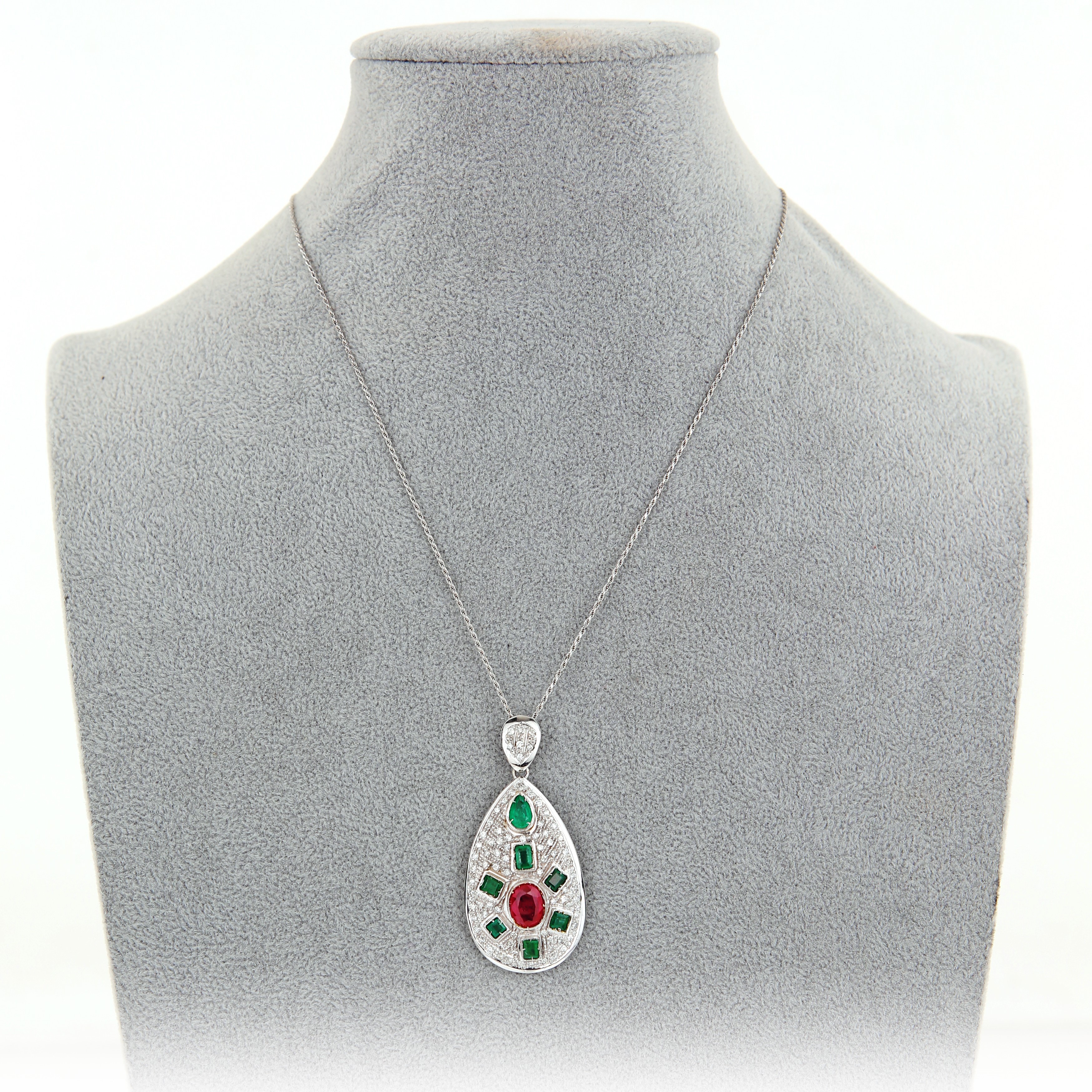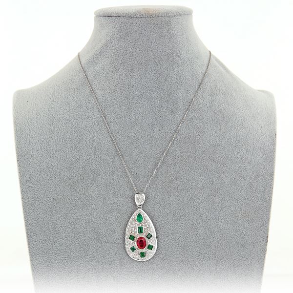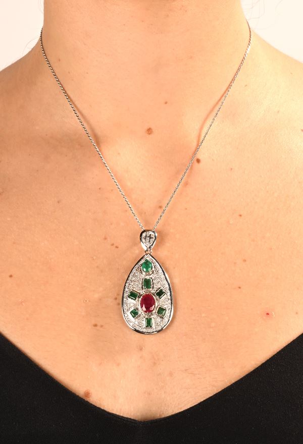 Oro bianco 750/000. Rubino ct 2 ca, smeraldi ct. 2,50 ca. Diamanti in taglio rotondo brillanti ct. 1,20. Peso complessivo gr. 15,50.