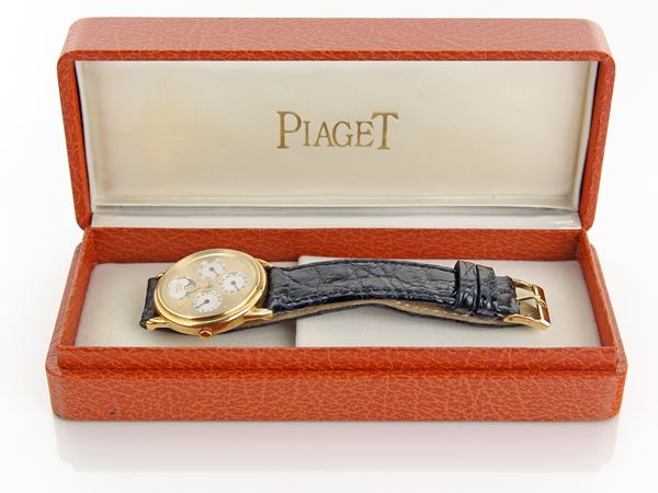 Oro giallo 750/000. Ref. 15958, cassa n. 526162. Fondello con viti. Fibbia Piaget in oro 18 kt, quadrante champagne e quadrantini dei calendari argentati, piccoli indici applicati. Movimento automatico, cal. 8532, 33 rubini, bilanciere monometallico, spirale piana. Accessori: astuccio Piaget