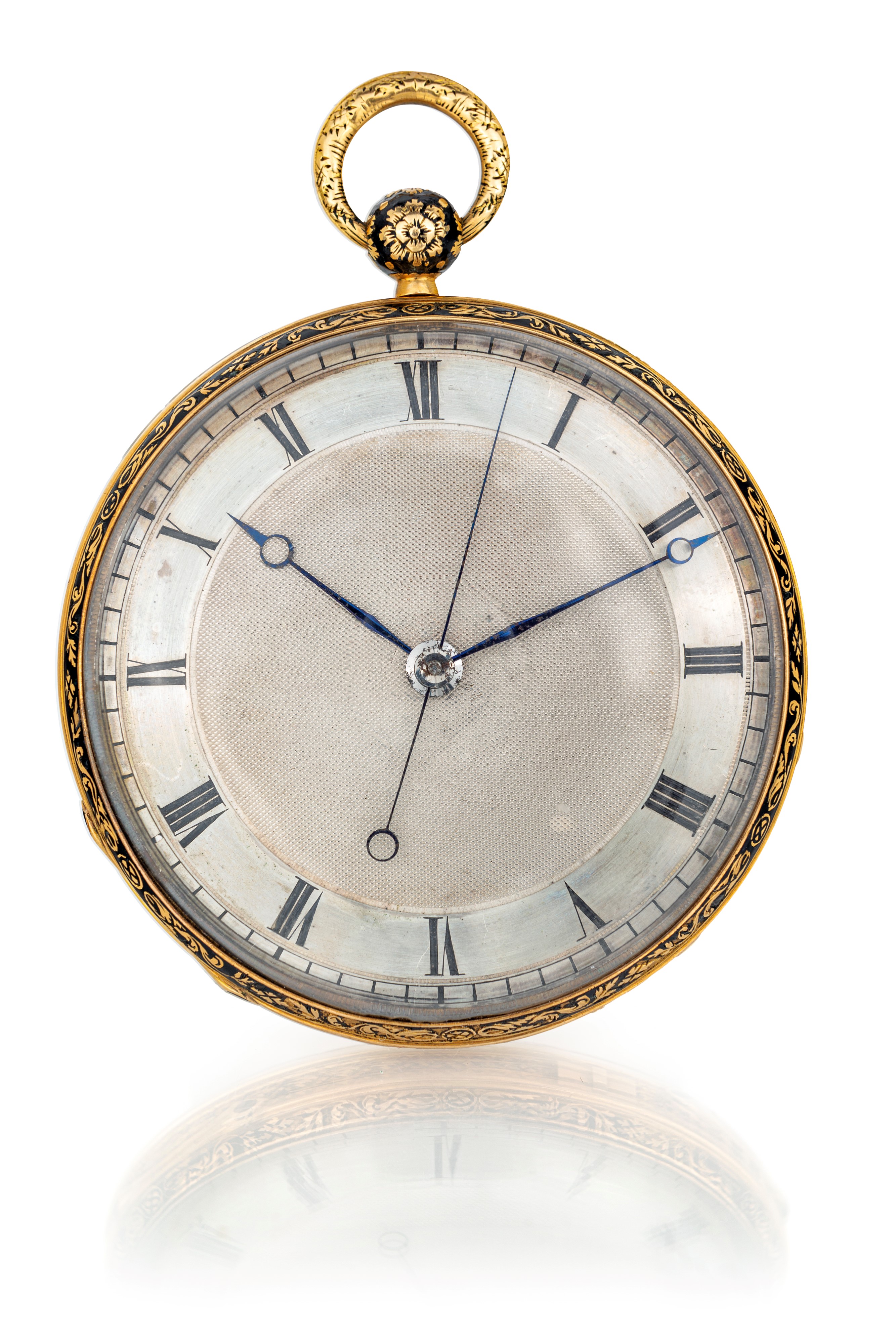 Oro giallo. Cassa decorata con smalto champleve nero, al centro uno stemma nobiliare con soprascritto un motto. Quadrante argentato decorato a guilloché, numeri romani, lancette breguet, secondi al centro. Movimento con carica a chiavetta, secondi indipendenti, scappamento a cilindro.