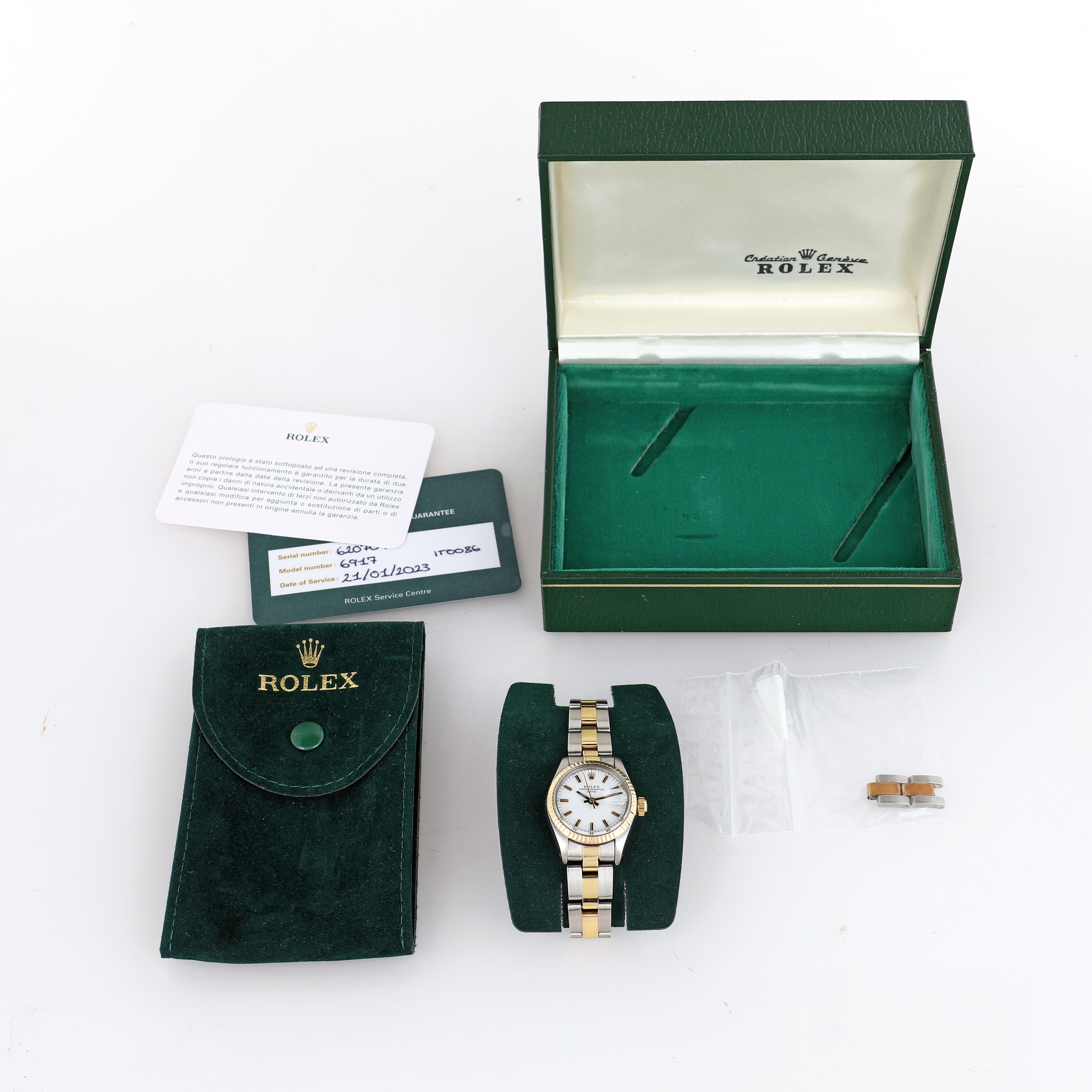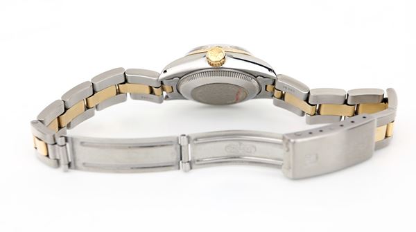Acciaio ed oro. Ref. n° 6917. Cassa n° 6207079, bracciale oyster in oro e acciaio. Quadrante bianco, indici applicati, data, secondi al centro. Movimento automatico cal. 2030 n° 772230, bilanciere monometallico, spirale piana. Accessori: astuccio Rolex n° 11.00.01, tessera centro servis Rolex, fattura di revisione. " maglie aggiuntive per il bracciale.