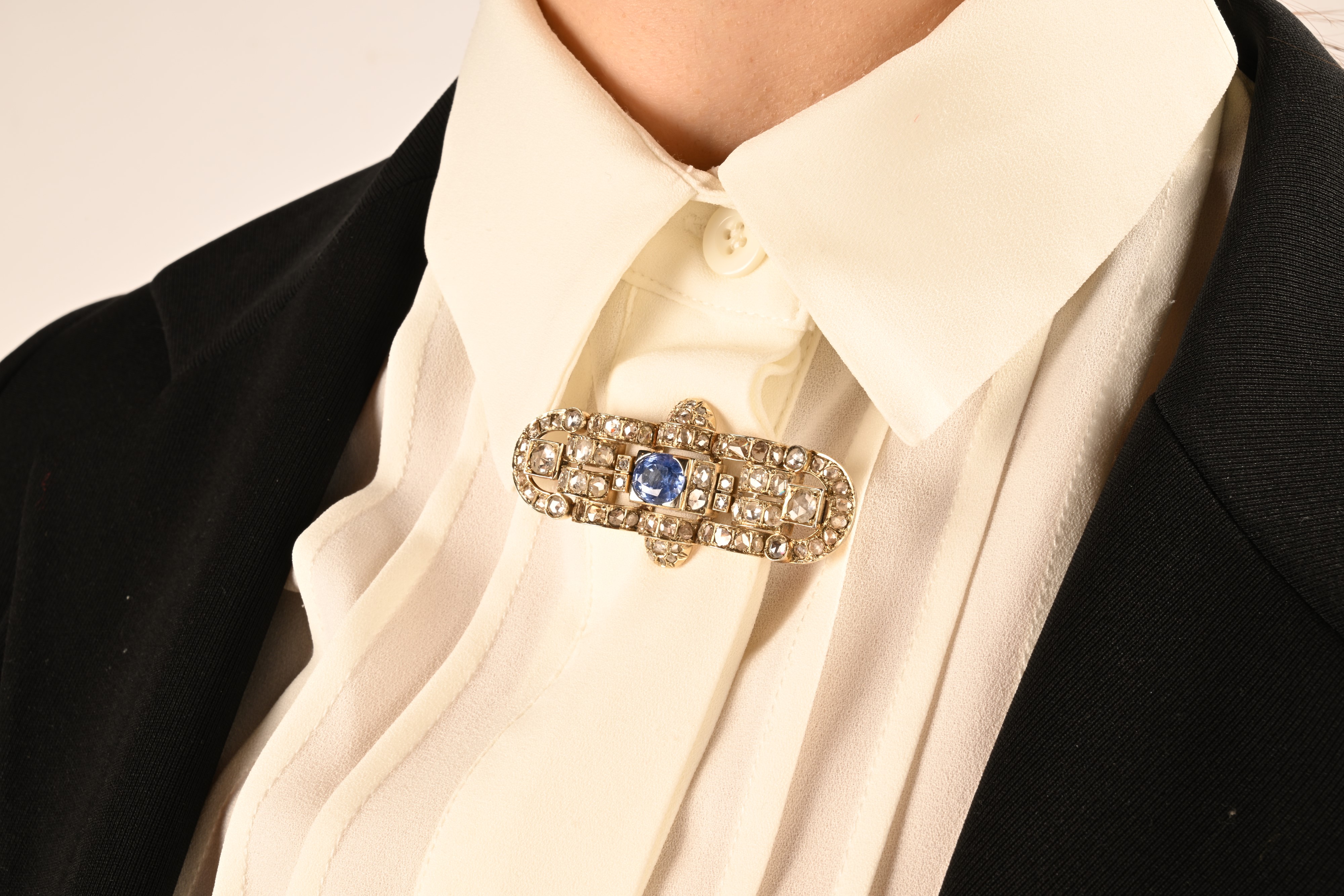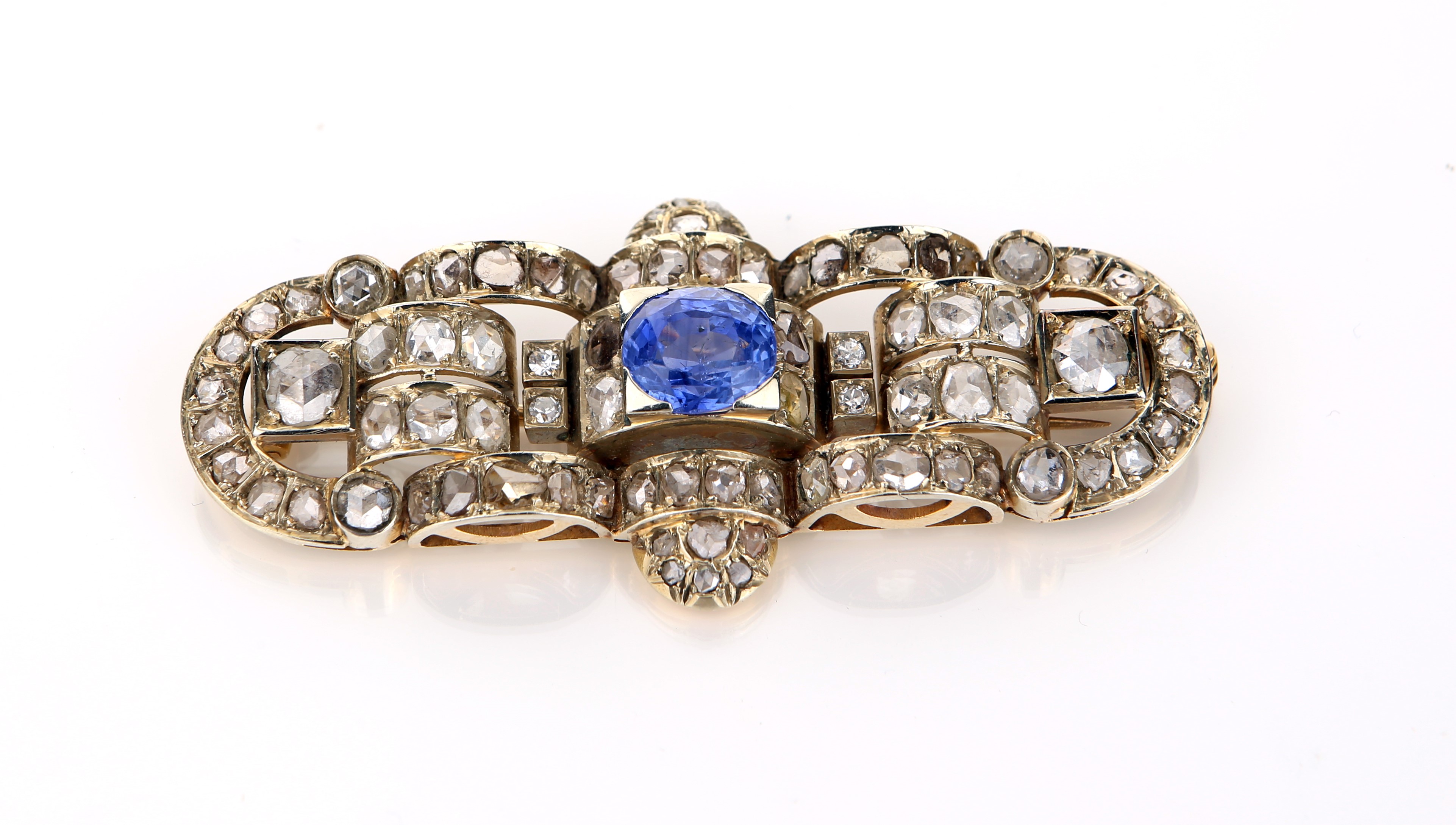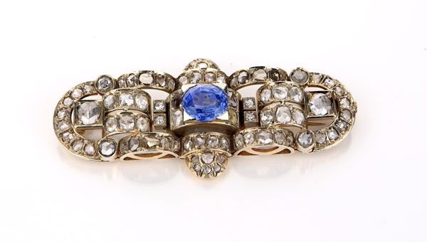 Oro giallo 750/000. Diamanti in taglio rosa, zaffiro in taglio ovale ct. 3 ca. Peso complessivo gr. 19,90