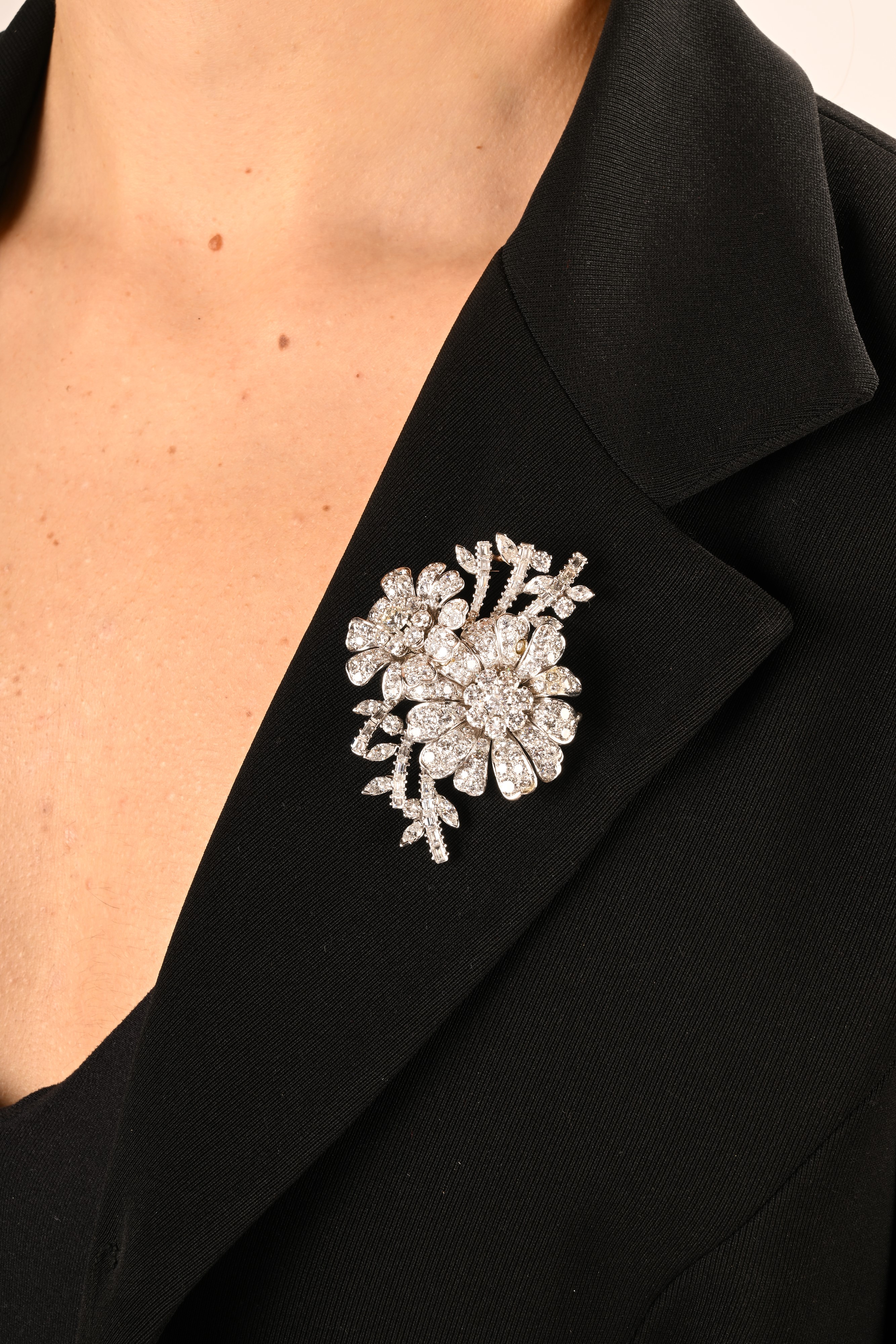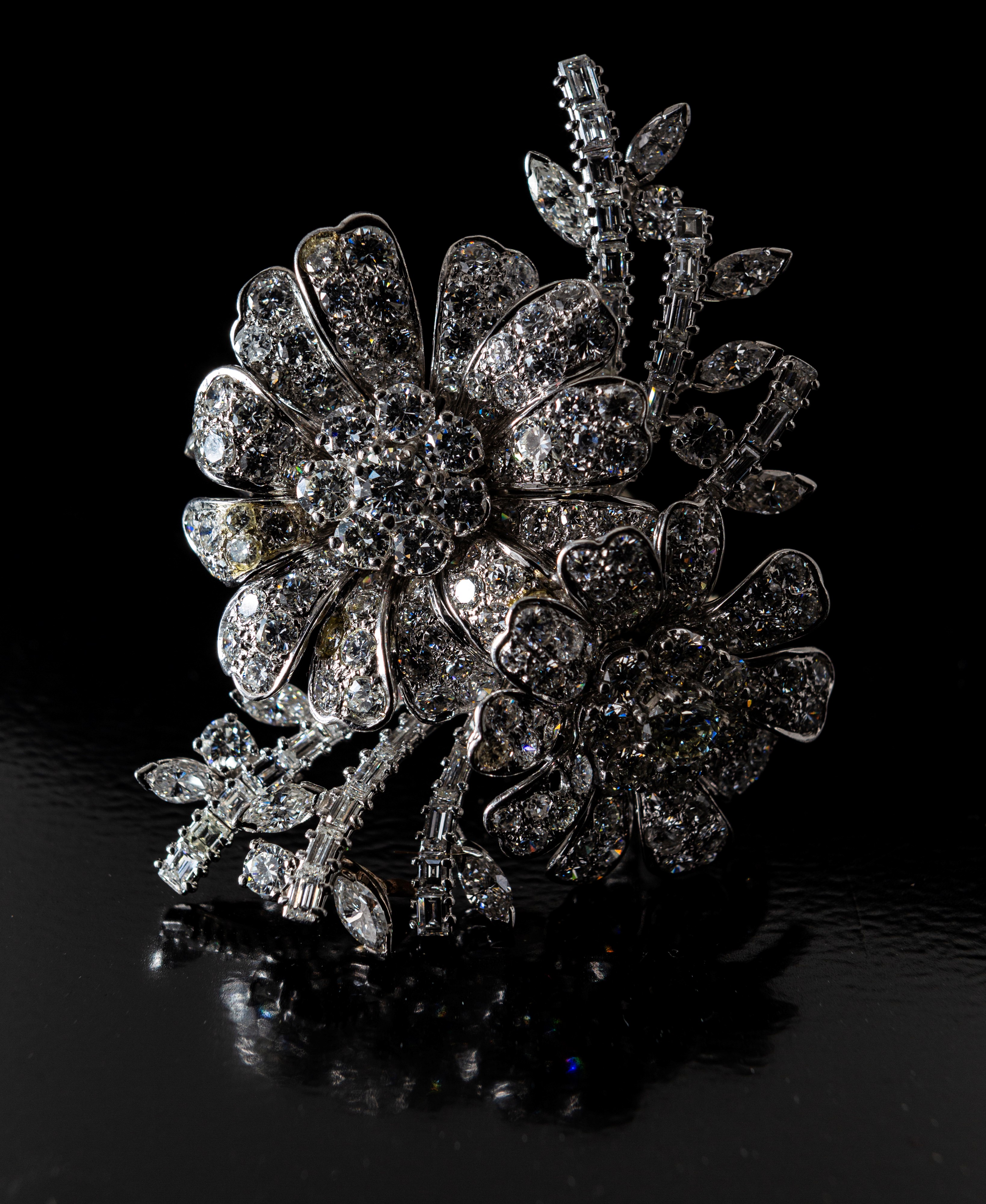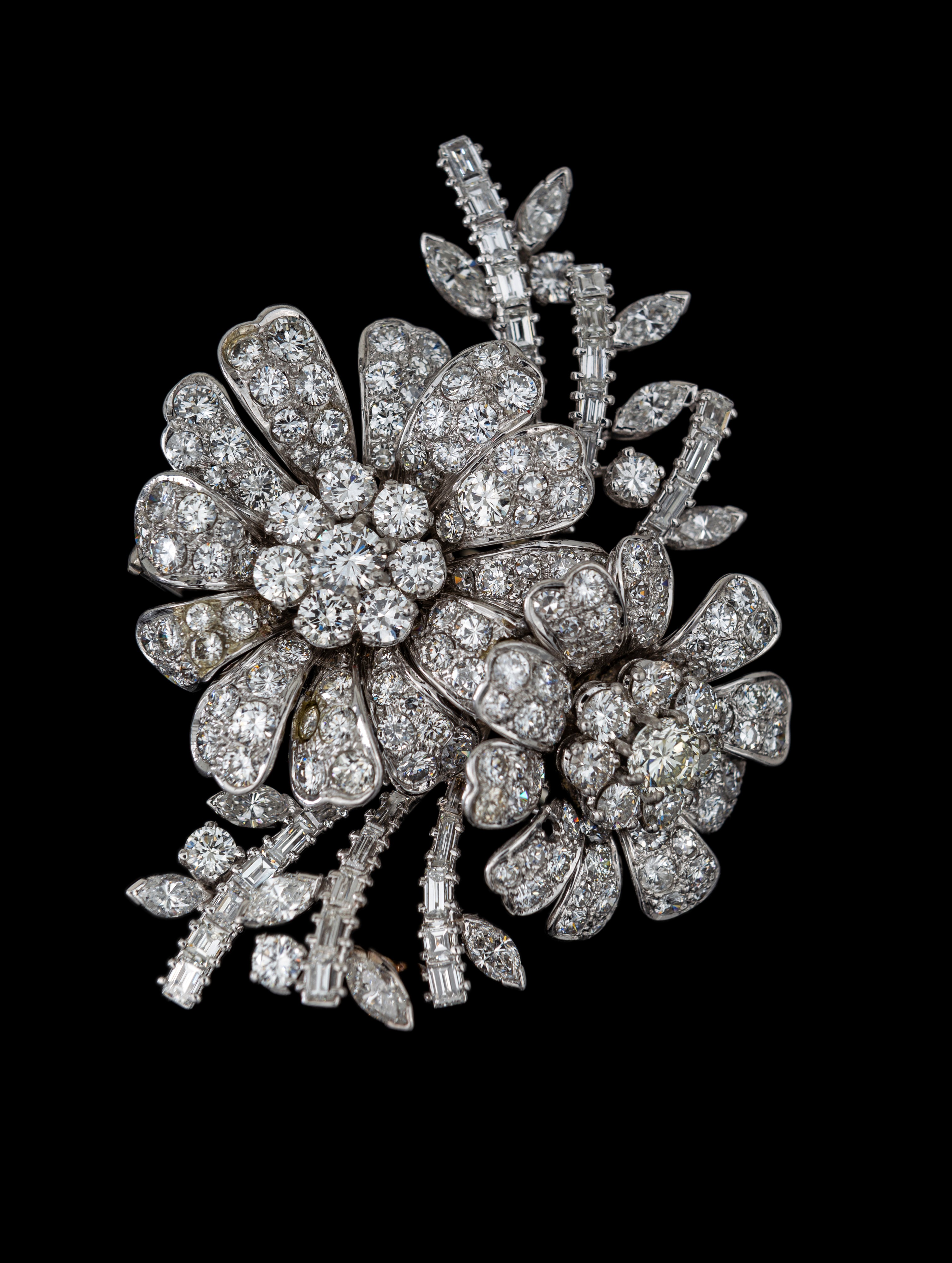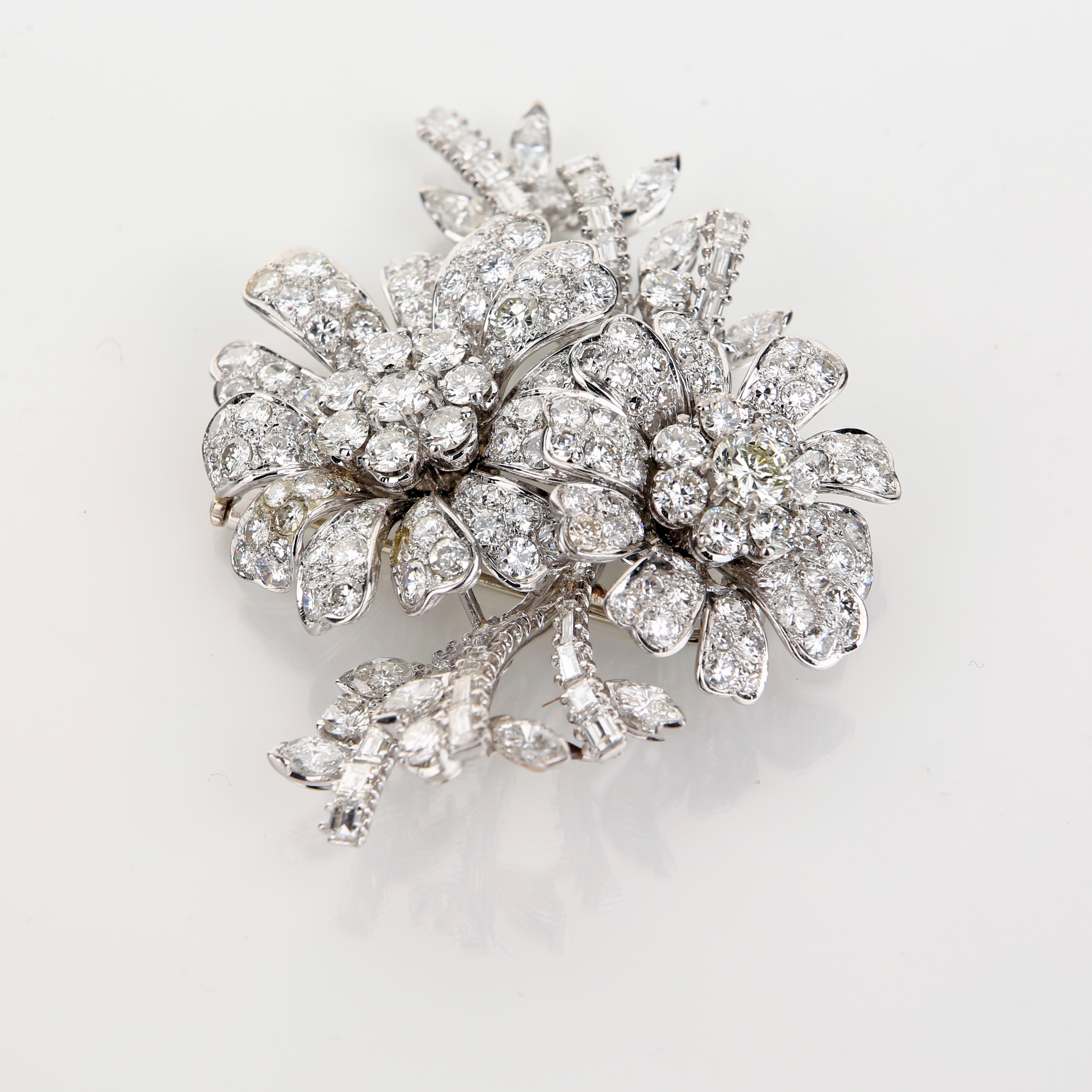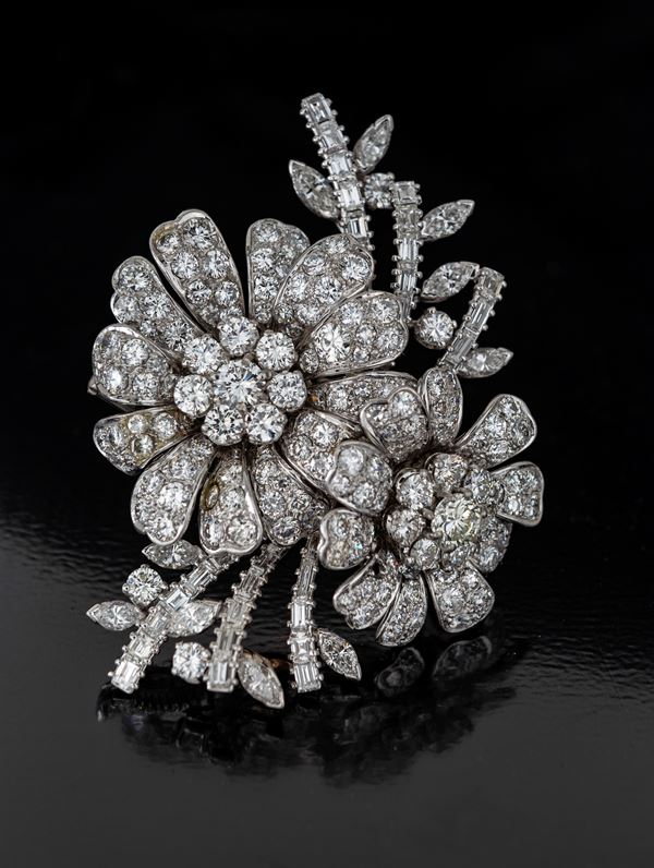 Platino 950/000. Diamanti in taglio rotondo brillante, baguettes, carrè, navette ct. 20 ca, prob F-G, VS-VVS. Peso complessivo gr. 36,70.